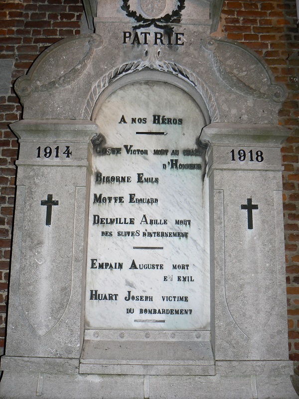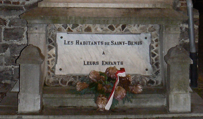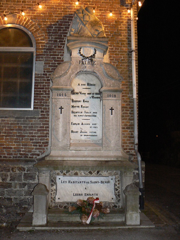 Localisation: Sur un des murs latéraux extérieurs de l'église, rue de la Brisée. Coordonnées GPS: +50° 29' 26.15", +4° 1' 5.42". Inscriptions figurant sur le monument "MEURTRIE MAIS VICTORIEUSE PATRIE À NOS HÉROS 1914 - 1918 [Quatre noms, classés par ordre alphabétique] [Deux noms, classés par ordre alphabétique] LES HABITANTS DE SAINT-DENIS À LEURS ENFANTS" Voir les noms gravés sur le monument |