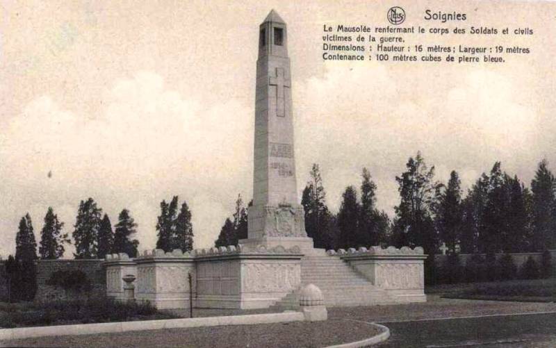 Localisation de ce monument: Devant le cimetière communal, Chaussée de Braine. Coordonnées GPS: +50°34'58.57", +4°04'40.58". Inscription figurant sur le monument Obélisque "À NOS HÉROS 1914- 1918" Dalles à l'arrière du mausolée "MILITAIRES [Trente-six noms, sur deux dalles, classés par ordre alphabétique sauf le dernier] DÉPORTÉS [Quarante-deux noms, sur deux dalles, classés par ordre alphabétique sauf quatre]" Sur les côtés avant et arrière et à l'arrière "[Septante noms (dont certains sont repris également dans la liste des déportés), avec statut, lieu et date de décès]" Informations complémentaires: Le Mausolée a été inauguré par le Prince Léopold le 13 juillet 1930. Dimensions: hauteur: 16 mètres - largeur: 19 mètres Contenance: 100 m3 de pierre bleue Voir les noms gravés sur le monument |