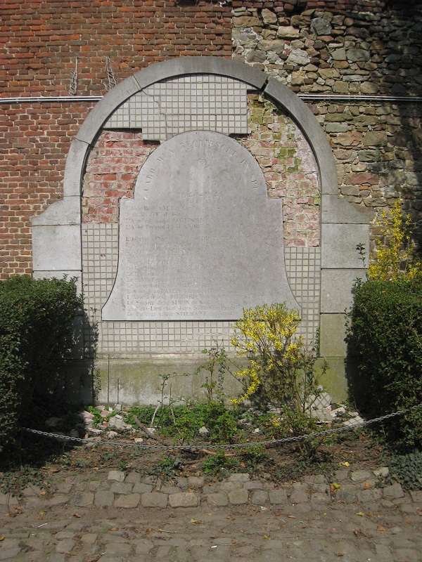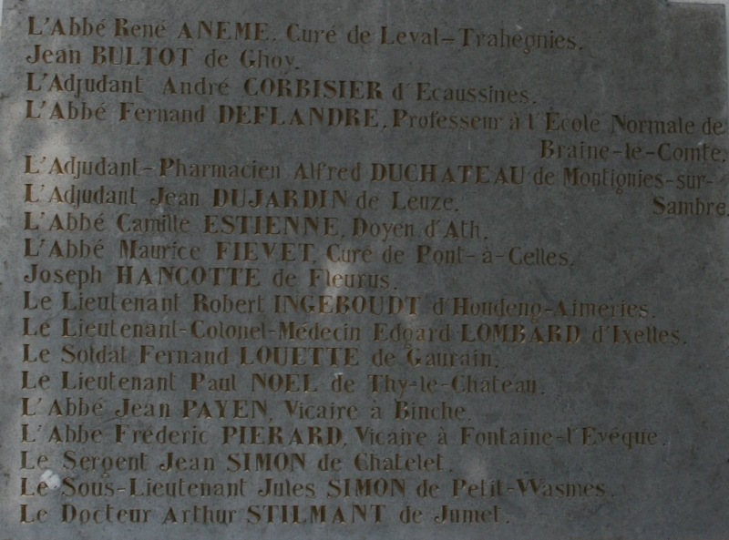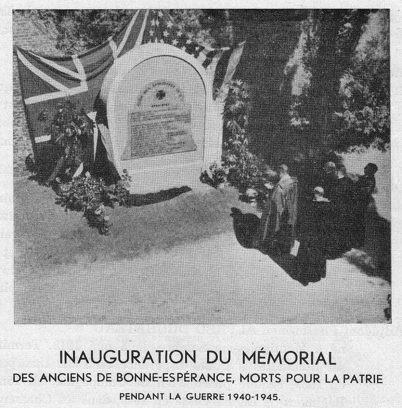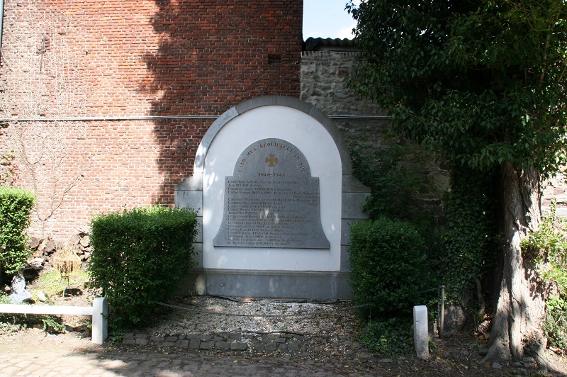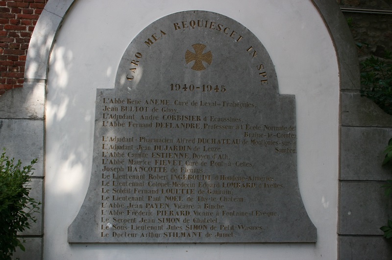 Localisation: Collège de Bonne-Espérance, Rue Grégoire JURION. Le monument se trouve à l’entrée de l’abbaye, juste à gauche après le porche. Coordonnées GPS: +50°23'10.0", +4°08'23.0" Inscriptions figurant sur le monument "CARO MEA REQUIESCET IN SPE [Ma chair reposera dans l'espérance (Livre des Psaumes -Psaume XV)] 1940 - 1945 [Dix-huit noms, classés par ordre alphabétique, avec mention du grade, du domicile pour les laïcs et de la paroisse pour les ecclésiastiques]" Informations complémentaires Tous les noms qui figurent sur le monument sont ceux d’anciens élèves ou professeurs du Collège qui ont trouvé la mort lors du second conflit mondial (Source: Anne FACHINAT, Collège de Bonne-Espérance). Voir les noms gravés sur le monument |
