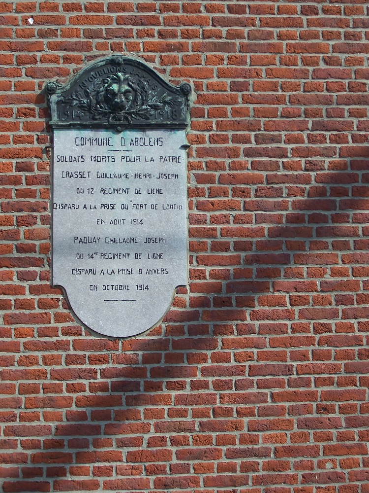 Localisation: Église Saint-Maurice, intersection des rues de Lens-Saint-Servais et de Grammia. Coordonnées GPS: +50°40'15.8", +5°09'00.7" Inscriptions "N'OUBLIONS JAMAIS 1914 - 1918 COMMUNE D'ABOLENS SOLDATS MORTS POUR LA PATRIE [Deux noms, avec mention du régiment ainsi que des lieu et date de décès]" Voir les noms mentionnés sur ce monument |