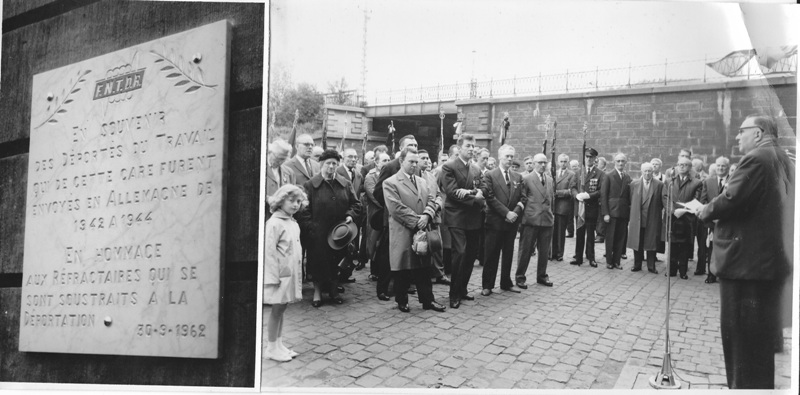 Localisation de cette plaque: Dans le hall d'entrée de la gare d'Angleur, aux abords de la E 25 et de la N 633 (tunnel et rond-point des Grosses Battes). Coordonnées GPS: +50°36'47.50", +5°35'59.99" Inscriptions figurant sur la plaque "F.N.T.D.R. EN SOUVENIR DES DÉPORTÉS DU TRAVAIL QUI DE CETTE GARE FURENT ENVOYÉS EN ALLEMAGNE DE 1942 À 1944 EN HOMMAGE AUX RÉFRACTAIRES QUI SE SONT SOUSTRAITS À LA DÉPORTATION 30-9-1962" Information complémentaire: F.N.T.D.R. = Fédération Nationale des Travailleurs Déportés et Réfractaires Ce monument ne comporte pas de noms |
