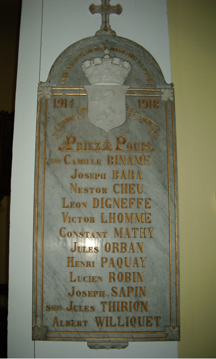 Localisation de cette plaque: À l'intérieur de l'église Saint-Martin, Rue Saint-Martin. Coordonnées GPS: +50°33'05.22", +5°14'09.62". Inscription figurant sur la plaque "À NOS VAILLANTS SOLDATS MORTS POUR LA PATRIE 1914 - 1918 L'UNION FAIT LA FORCE PRIEZ POUR [Douze noms, classés par ordre alphabétique sauf les deux premiers, sur deux colonnes]" Informations complémentaires La plaque est en marbre et mesure +ou- 1,50 m de haut. Voir les noms gravés sur la plaque |