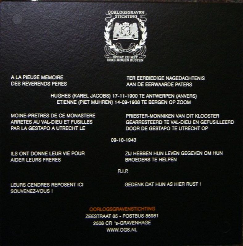 Localisation de cette plaque: À l'intérieur de la Basilique de l'Abbaye N-D du Val Dieu, route du Val Dieu. Coordonnées GPS: +50°41'53.25", +5°48'19.42". Inscription figurant sur la plaque "À LA PIEUSE MÉMOIRE TER EERBIEDIGE NAGEDACHTENS DES RÉVÉRENDS PÈRES AAN DE EERWAARDE PATERS [Deux noms, non classés par ordre alphabétique] MOINE-PRÊTRES DE CE MONASTÈRE PRIESTER-MONNIKEN VAN DIT KLOOSTER ARRÊTÉS AU VAL-DIEU ET FUSILLÉS GEARRESTEERD TE VAL-DIEU EN GEFUSILLEERD PAR LA GESTAPO À UTRECHT LE DOOR DE GESTAPO TE UTRECHT OP 09-10-1943 ILS ONT DONNÉ LEUR VIE POUR ZIJ HEBBEN HUN LEVEN GEGEVEN OM HUN AIDER LEURS FRÈRES BROEDERS TE HELPEN R.I.P. LEURS CENDRES REPOSENT ICI GEDENK DAT HUN AS HIER RUST ! SOUVENEZ-VOUS ! OORLOGSGRAVENSTICHTING ZEESTRAAT 85 - POSTBUS 85981 2508 CR'S-GRAVENHAGE WWW.OGS.NL" Voir les noms mentionnés sur cette plaque |