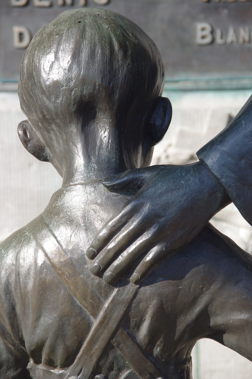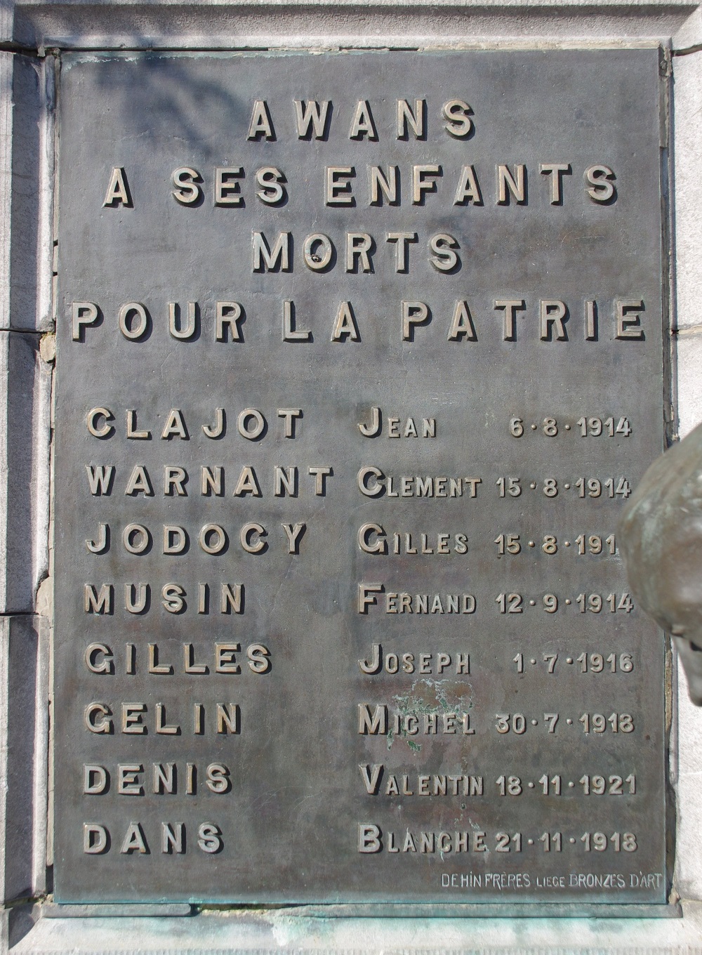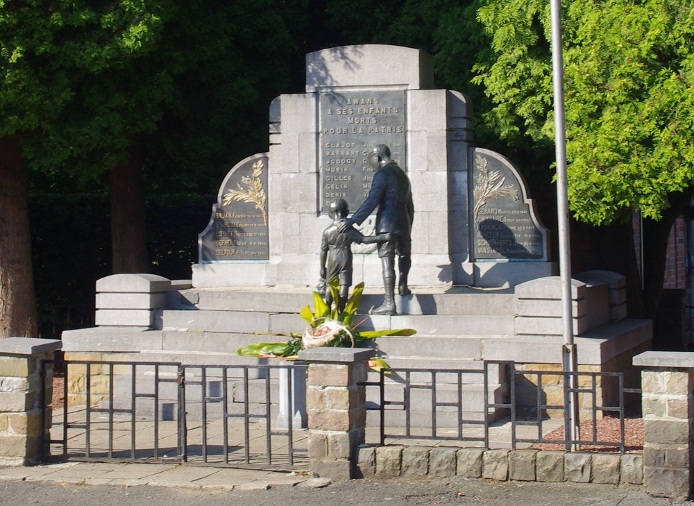 Localisation: Place communale. Coordonnées GPS: +50° 40' 1.90", +5° 27' 46.00". Inscriptions Panneau central "AWANS À SES ENFANTS MORTS POUR LA PATRIE [Huit noms de personnes décédées en 1914-1918, non classées par ordre alphabétique, avec indication de la date de décès]" Panneau gauche "[Cinq noms de personnes décédées en 1940-1945, classées par ordre alphabétique, avec indication de la date de décès]" Panneau droit "[Six noms de personnes décédées en 1940-1945, classées par ordre alphabétique, avec indication de la date de décès]" Réalisation de la statue: Bronzes d'art DEHIN Frères, Liège (signé). Voir les noms gravés sur ce monument |
