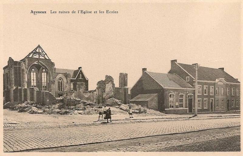 Localisation de ces plaques: Avenue de la Libération, sur la façade de l'école communale, juste à côté de l'église. Coordonnées GPS: +50°36'30.42", +5°42'52.58". Inscription figurant sur les plaques Stèles à gauche de l'entrée de l'école "HOMMAGE RECONNAISSANT DES RÉFUGIÉS FRANÇAIS DE ROUBAIX AUX HABITANTS D'AYENEUX SEPTEMBRE 1918" "V. L. POLET FUSILLÉ PAR LES ALLEMANDS ENSEIGNA DANS CETTE CLASSE (PENDANT 28 ANS) [Dates et lieux de naissance et de décès]" Stèle à droite "N'OUBLIONS JAMAIS 1914 - 1918 COMMUNE D'AYENEUX LE 5 AOÛT 1914 LES ALLEMANDS ONT ASSASSINÉ 5 PERSONNES LE 6 AOÛT 1914 LES ALLEMANDS ONT ASSASSINÉ 2 PERSONNES BRÛLÉ 2 MAISONS ONT ÉTÉ FUSILLÉS [Sept noms, classés par ordre alphabétique, avec une exception] MORTS SOUS LES DRAPEAUX [Deux noms, non classés par ordre alphabétique]" Voir les noms gravés sur les plaques |