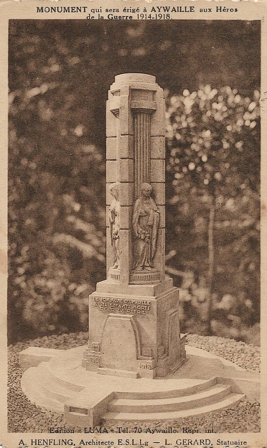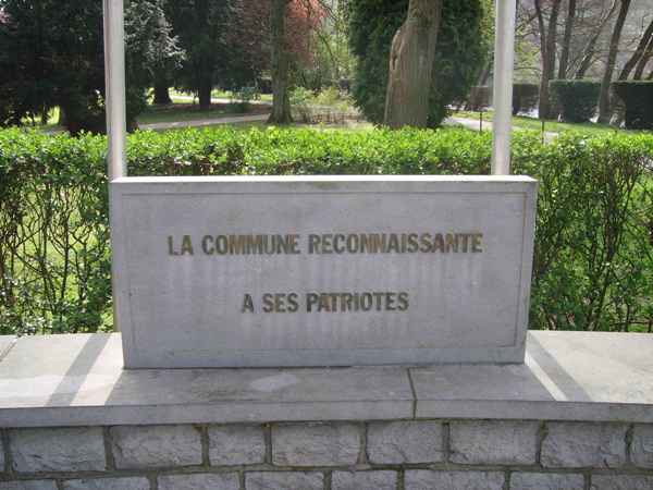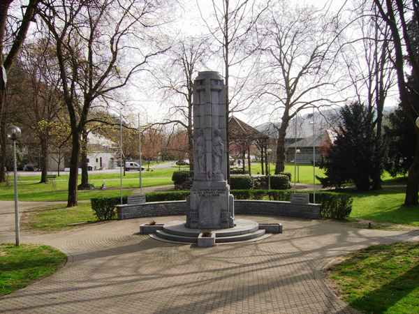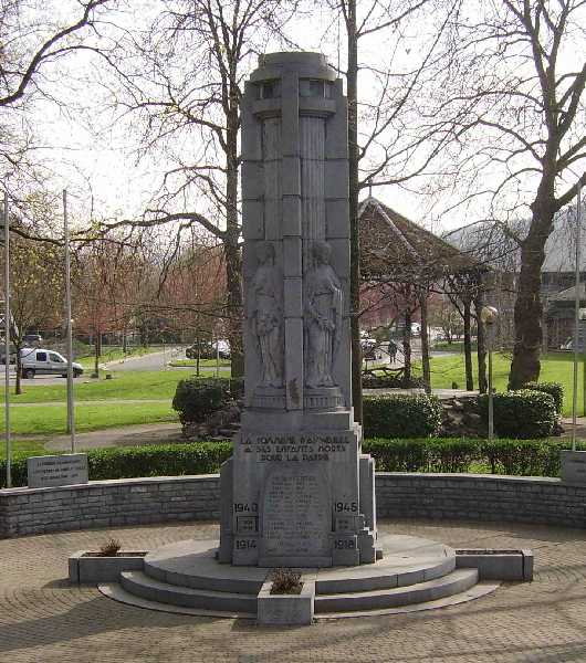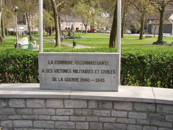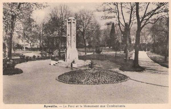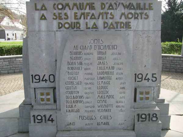Localisation: Parc Docteur Louis THIRY, près du pont qui enjambe l'Amblève. Coordonnées GPS: 50° 28' 33" N, 5° 40' 31" E. Inscriptions Monument proprement dit "LA COMMUNE D'AYWAILLE À SES ENFANTS MORTS POUR LA PATRIE MORTS / AU CHAMP D'HONNEUR [Vingt-six noms] FUSILLÉS CIVILS [Deux noms] 1914-1918 1940-1945" Plaque de gauche sur le muret derrière le monument "LA COMMUNE RECONNAISSANTE À SES VICTIMES MILITAIRES ET CIVILES DE LA GUERRE 1940-1945" Plaque de droite sur le