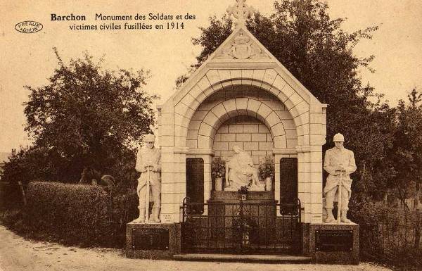 Localisation de ce monument: Au croisement de la rue Justin SAUVENIER (N642) et de la rue du Canada. Coordonnées GPS: +50°40'09.26", +5°42'17.87". Inscription figurant sur ce monument Au fronton "1914 - 1918" Stèle sous la statue de gauche "BARCHON À SES HÉROS SOLDATS MORTS POUR LA PATRIE [Trois noms de 1914-1918, rangés par ordre alphabétique, avec indication du lieu et de la date de décès] PRISONNIERS - CIVILS [Quatre noms, rangés par ordre alphabétique sur deux colonnes]" Stèle sous la statue de droite "BARCHON À SES HÉROS COMBATTANTS [Onze noms, rangés par ordre alphabétique, avec une exception]" Sur le pilier à gauche de la statue de la Vierge "BARCHON À SES MARTYRS ASSASSINÉS PAR LES ALLEMANDS EN AOÛT 1914 [Dix-huit noms, classés par ordre alphabétique, sauf les femmes qui sont classées avec leur mari ou sous le nom de celui-ci]" Sur le pilier à droite de la statue de la Vierge "BARCHON À SES MARTYRS ASSASSINÉS PAR LES ALLEMANDS EN AOÛT 1914 [Dix-sept noms, classés par ordre alphabétique, sauf les femmes qui sont classées avec leur mari ou sous le nom de celui-ci]" Premier panneau (en partant de la gauche) sous la statue de la Vierge "NOS 1940 PRISONNIERS POLES 1945 [Sept noms, non classés par ordre alphabétique]" Deuxième panneau (en partant de la gauche) sous la statue de la Vierge "NOS COMBATTANTS [Huit noms, non classés par ordre alphabétique]" Troisième panneau (en partant de la gauche) sous la statue de la Vierge "1940 - 1945 LISTE DES PRISONNIERS [Vingt-et-un noms, non classés par ordre alphabétique]" Quatrième panneau (en partant de la gauche) sous la statue de la Vierge "1940 - 1945 NOS COMBATTANTS [Huit noms, non classés par ordre alphabétique]" Cinquième panneau (en partant de la gauche) sous la statue de la Vierge "1940 VICTIMES RÉSCE 1945 [Trois noms, non classés par ordre alphabétique] PRIER MORT EN CAPTÉ [Un nom] PRIER MORT ACCT [Un nom] VICTIMES CIVILES [Trois noms]" Décision de construction: Décembre 1921 (Source [113]) Inauguration: 11 novembre 1927 (Source [113]) Commanditaires: Le comité du "monument" et l’administration communale (Source [113]) Prix: Entre 10 000 et 12 000 francs (Source [113]) Financement: Souscriptions publiques et fêtes (Source [113]) Voir les noms gravés sur ce monument |
