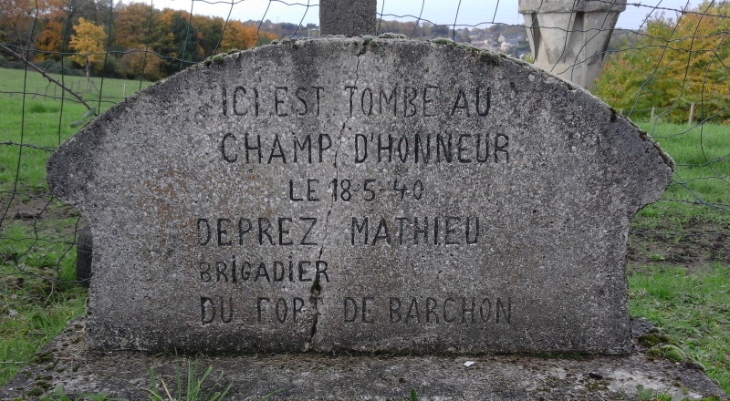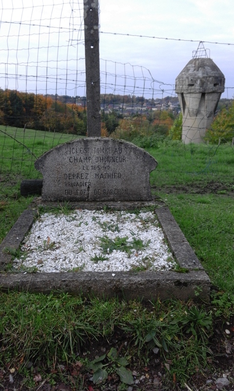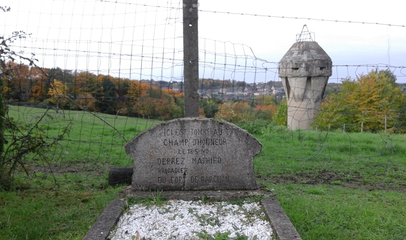 Localisation de ce monument: Rue aux Ruelles (le long de la partie "sentier empierré", reliant la Rue du Fort et la Rue Corinhez), face à la tour d'aération du fort de Barchon. Coordonnées GPS: +50°40'23.64", +5°41'12.40" Inscriptions figurant sur le monument "ICI EST TOMBÉ AU CHAMP D'HONNEUR LE 18-5-1940 DEPREZ MATHIEU BRIGADIER DU FORT DE BARCHON" Plus d'informations concernant cette personne |