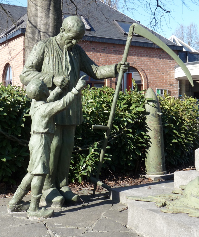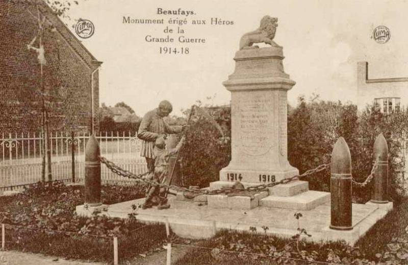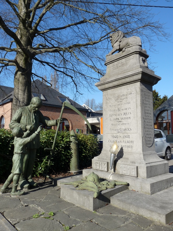 Localisation de ce monument: Voie de l'Air pur (RN 30). Coordonnées GPS: +50° 33' 51.80", +5° 38' 04.55". Inscription figurant sur le monument Face avant "À NOS DÉFENSEURS 1914 - 1918 LA COMMUNE DE BEAUFAYS RECONNAISSANTE MORTS POUR LA PATRIE [Trois noms, classés par ordre alphabétique] MORT EN CAPTIVITÉ [Un nom] 1940 - 1945 [Deux noms] 1914 - 1918" Face droite "SURVIVANTS [Dix-huit noms, non classés par ordre alphabétique]" Face gauche "SURVIVANTS [Dix-huit noms, non classés par ordre alphabétique]" Informations complémentaires: Ce monument a été érigé peu après l'armistice, en 1919 ou 1920. En 1930, pour fêter le centenaire de l'Indépendance, la commune fit planter un hêtre, baptisé "Arbre de la Liberté". Ensuite fut ajoutée une sculpture représentant un paysan tenant, d'une main, une faux meurtrière représentant "la guerre tueuse d'hommes" et, de l'autre main, un petit garçon de cinq ans écoutant les explications de son grand-père, les yeux rivés vers le ciel espérant des jours meilleurs. Le sculpteur qui a réalisé l'œuvre est Jacques LALOUX. Henri CRAHAY et Gaby CLOSJANS sont les personnes qui ont servi de modèles. Pour l'occasion, Henri CRAHAY, modèle pour le paysan dut revêtir un sarrau et les deux durent chausser des sabots (Source: Françoise SCHRÖDER-CLOSJANS de Louveigné dans un article paru dans la rubrique "Petite gazette de l'anecdote et de l'insolite" par René HENRY dans Vlan - Messager du Condroz, n° 13 du 27/03/2014) Voir les noms gravés sur ce monument |