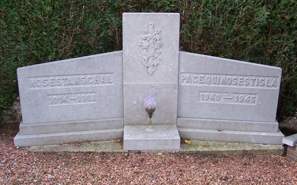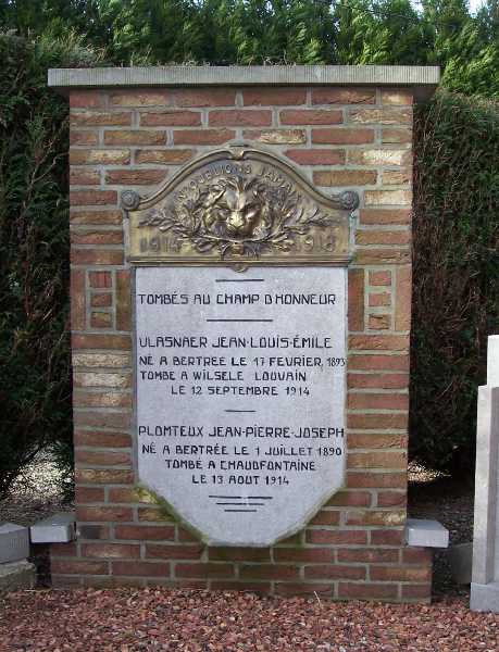 Localisation: Cimetière qui entoure l'église et juste en face de la porte de celle-ci, au coin de la rue Lambert Georges et rue de la Brasserie. Coordonnées GPS: +50° 41' 40.45", +5° 05' 22.03" Inscriptions figurant sur le monument Monument de gauche "NOS ESTANS CHAL PACE QUI NOS ESTIS LA 1914 - 1918 1940 - 1945" Traduction française: Nous sommes ici parce que nous sommes allés là-bas Monument de droite "N'OUBLIONS JAMAIS 1914 - 1918 TOMBÉS AU CHAMP D'HONNEUR [Deux noms, non classés par ordre alphabétique, avec mention de la date et du lieu de naissance et de décès]" Voir les noms mentionnés sur ce monument |