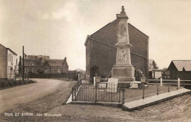 Localisation de ce monument: Au croisement des rues du Tige, des Awirs, de Bassine, de Borsu et des Sarts. Coordonnées GPS: +50°23'29.97", +5°19'25.96". Inscription figurant sur le monument Face avant "1914 - 1918 1940 - 1945 BOIS-BORSU À SES HÉROS MORTS POUR LA PATRIE [Cinq noms, dont quatre classés par ordre alphabétique sur deux colonnes et le cinquième étant présenté au-dessus en raison de son grade]" Face latérale 1 "[Vingt-deux noms, classés par ordre alphabétique sur deux colonnes, trois noms étant précédés d'une croix]" Face latérale 2 "[Vingt-et-un noms, classés par ordre alphabétique sur deux colonnes, cinq noms étant précédés d'une croix]" Pierre dressée devant le monument "1940 - 1945 LES PRISONNIERS ET COMBATTANTS DE BOIS BORSU À LEURS FRÈRES D'ARMES COMBATTANT [Un nom] PRISONNIERS DE GUERRE [Deux noms, classés par ordre alphabétique] RÉSISTANT [Un nom] PRISONNIERS POLITIQUES [Trois noms, classés par ordre alphabétique]" Plaque commémorative 1 "BOIS BORSU À SON PRISONNIER POLITIQUE JULES VINCENT DÉCÉDÉ À DORA LE 2 NOVEMBRE 1944" Plaque commémorative 2 ""BOIS BORSU À SON PRISONNIER POLITIQUE GASTON GRAINDORGE DÉCÉDÉ À DACHAU LE 11 FÉVRIER 1945" Voir les noms gravés sur le monument |
