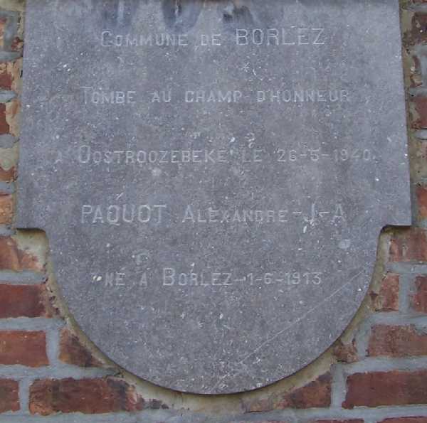 Localisation de ce monument: Rue Albert 1er, sur une maison à l'entrée du village. Coordonnées GPS: 50° 37' 55" N, 5° 15' 01" E (carrefour Rue Albert 1er et rue d'Aineffe) Inscription figurant sur le monument "N'OUBLIONS JAMAIS 1940 - 1945 COMMUNE DE BORLEZ TOMBÉ AU CHAMP D'HONNEUR [Un nom]" Plus d'informations concernant cette personne |