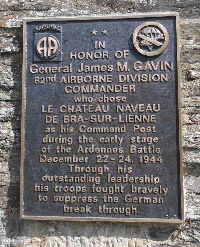 Localisation de cette plaque: Sur le porche d'entrée du château de Bra, sur la N 651 entre La Coulée et Sur les Fâts. Coordonnées GPS: +50°19'24.45", +5°44'00.82". Inscription figurant sur la plaque "IN HONOR OF GENERAL JAMES M. GAVIN 82ND AIRBORNE DIVISION COMMANDER WHO CHOSE LE CHATEAU NAVEAU DE BRA–SUR–LIENNE AS HIS COMMAND POST DURING THE EARLY STAGE OF THE ARDENNES BATTLE DECEMBER 22–24, 1944 TROUGH HIS OUTSTANDING LEADERSHIP HIS TROOPS FOUGHT BRAVELY TO SUPPRESS THE GERMAN BREAK THROUGH." Plus d'informations concernant cette personne |