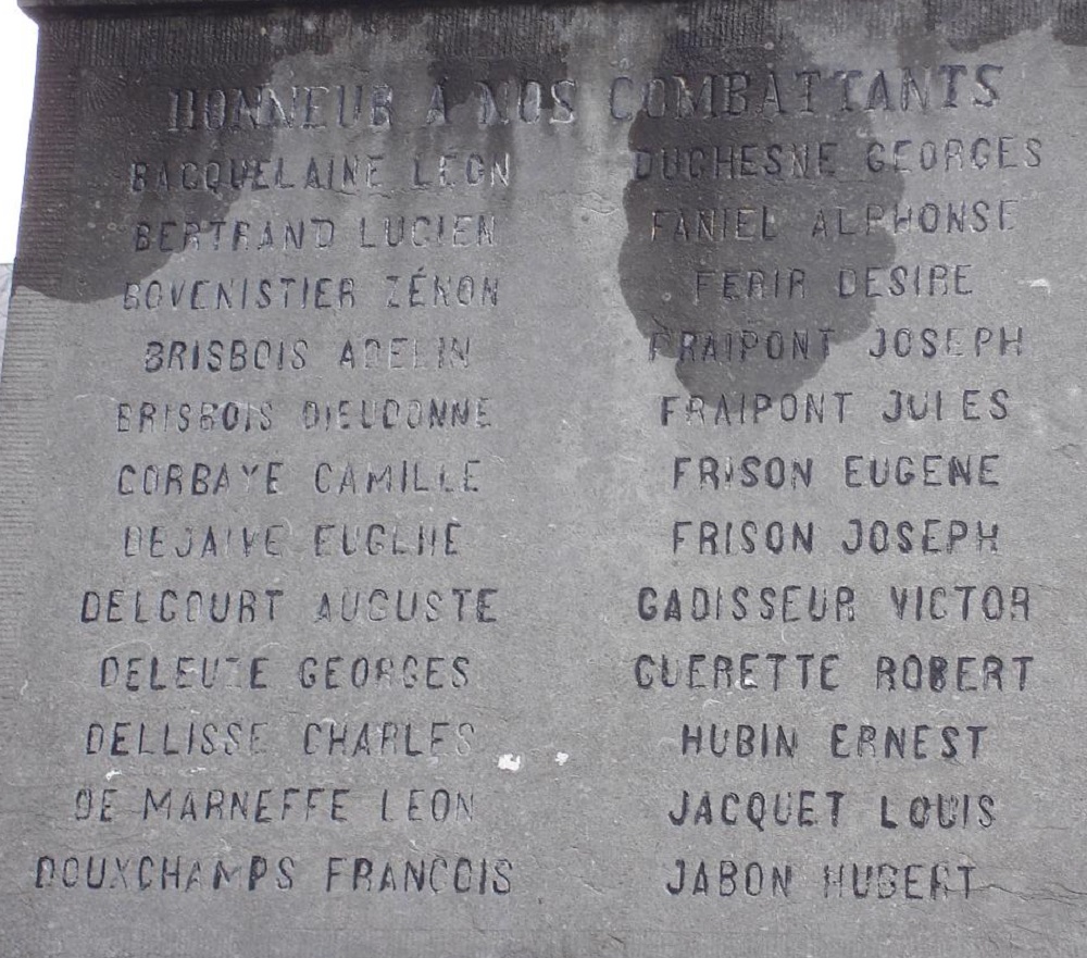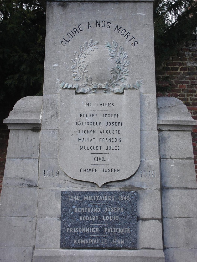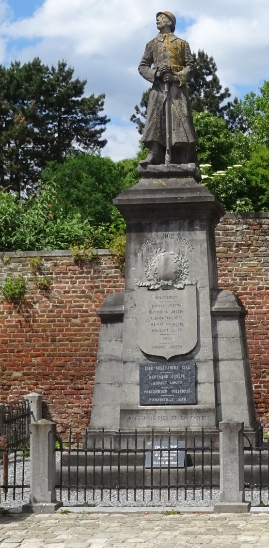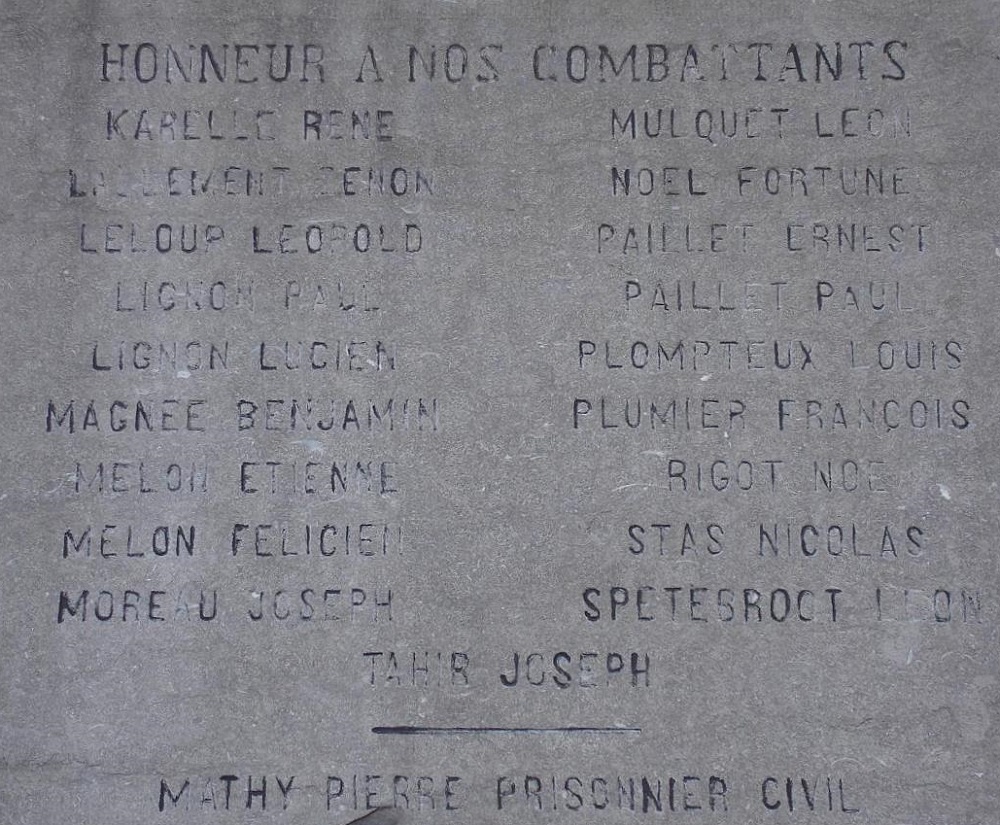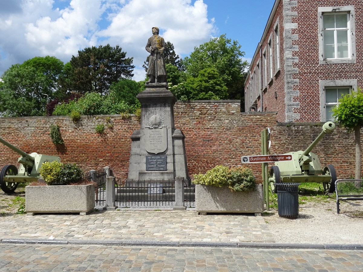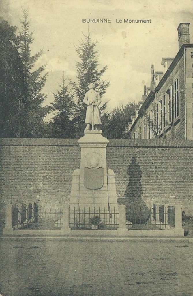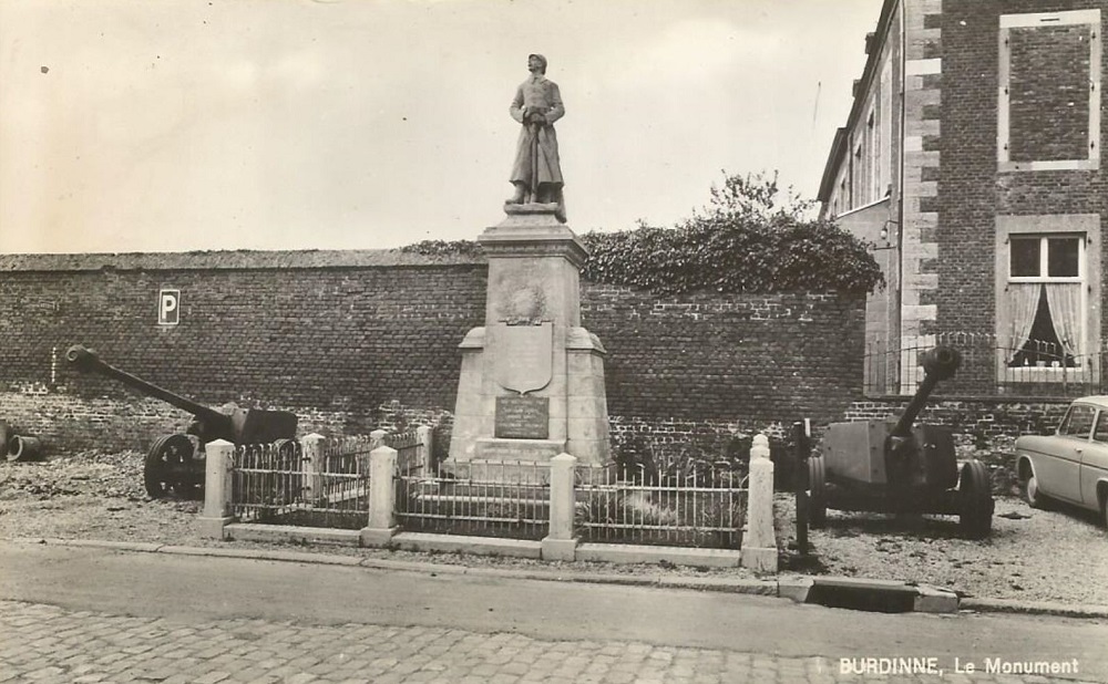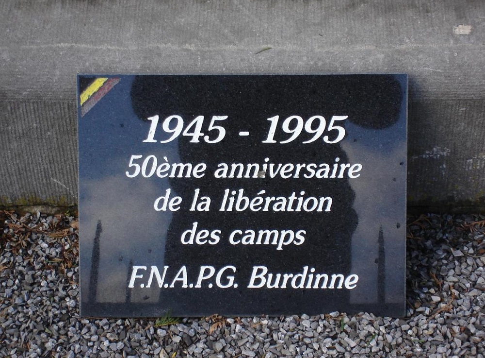 Localisation: Grand-Place. Coordonnées GPS: +50°35'01.31", +5° 04' 21.19" Inscriptions Face avant "GLOIRE À NOS MORTS MILITAIRES [Cinq noms] CIVIL [Un nom] 1914 - 1918 1940 - MILITAIRES - 1945 [Deux noms] PRISONNIER POLITIQUE [Un nom]" MORTS POUR DIEU ET LA PATRIE" Plaque au pied du monument "1945 - 1995 50ÈME ANNIVERSAIRE DE LA LIBÉRATION DES CAMPS F.N.A.P.G. BURDINNE" Face latérale 1 "HONNEUR À NOS COMBATTANTS [Vingt-quatre noms]" Face latérale 2 "HONNEUR À NOS COMBATTANTS [Dix-neuf noms] PRISONNIER CIVIL [Un nom]" Voir les noms mentionnés sur ce monument |