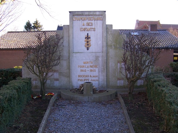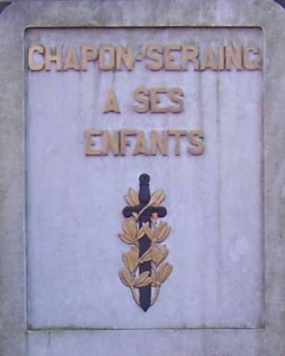 Localisation de ce monument: Rue Guillaume BOLLY. Coordonnées GPS: +50°36'33.37", +5°16'15.42". Inscription figurant sur le monument Panneau central "CHAPON-SERAING À SES ENFANTS MORTS POUR LA PATRIE 1940 - 1945 [Deux noms classés par ordre alphabétique]" Panneau gauche "À NOS / DÉFENSEURS 1914 - 1918" Panneau droit "À NOS / DÉFENSEURS 1940 - 1945" Voir les noms mentionnés sur ce monument |