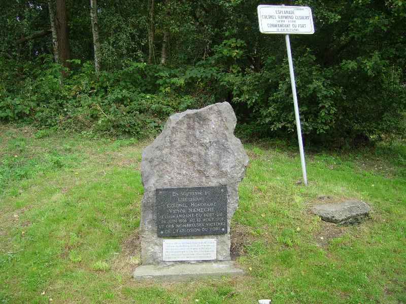 Localisation de cette stèle et de ces plaques: À proximité de la poterne du fort, rue du XIII Août, sur l'Esplanade Colonel R. Clobert et sur le mur d'enceinte du fort. Coordonnées GPS: +50°35'30.45", +5°38'25.92". Inscriptions figurant sur la stèle et sur les plaques Sur la stèle "EN SOUVENIR DU LIEUTENANT COLONEL HONORAIRE VICTOR NAMECHE COMMANDANT DU FORT DU 26 JUIN 1906 AU 13 AOÛT 1914 ET DES NOMBREUSES VICTIMES DE L'EXPLOSION DU FORT" Sur la plaque sous la stèle "CONSTRUIT EN 1880, SOUS LA DIRECTION DU GÉNÉRAL BRIALMONT, LE FORT DE CHAUDFONTAINE AVEC CELUI D'EMBOURG FAIT PARTIE DE LA CEINTURE DÉFENSIVE DE LIÈGE. IL JOUA DANS LA RÉSISTANCE DE LA CITÉ ARDENTE, EN 1914, COMME EN 1940, UN RÔLE DE PREMIER PLAN. LE 13 AOÛT 1914, UN OBUS ALLEMAND TOMBE DANS LA VOÛTE DU MAGASIN À MUNITIONS AUXQUELLES IL MIT LE FEU, SOULEVA L'OUVRAGE ET ENSEVELIT, SOUS LES RUINES FUMANTES, LA COURAGEUSE GARNISON." Sur la plaque à côté de la stèle "CHAUDFONTAINE ESPLANADE COLONEL RAYMOND CLOBERT 5.8.1898 - 8.3.1982 COMMANDANT DU FORT DE 1936 AU 17.5.1940" Sur la plaque sur le mur d'enceinte du fort "L'AMICALE DU FORT DE CHAUDFONTAINE À SES MORTS DE MAI 40 [Deux noms, non classés par ordre alphabétique]" Plus d'informations concernant le fort de Chaudfontaine: Le fort de Chaudfontaine Plus d'informations concernant ces personnes |