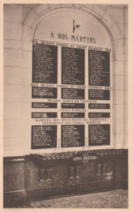 Localisation de ces plaques: À l'intérieur de l'ancienne maison communale, 1 Place Joseph Willem. Coordonnées GPS: +50°36'38.40", +5°36'55.75". Inscription figurant sur les plaques Plaques principales "À NOS MARTYRS 1914 SOLDATS TOMBÉS AU CHAMP D'HONNEUR 1918 [Cinquante-sept noms, classés par ordre alphabétique, sur trois colonnes] 1940 SOLDATS TOMBÉS AU CHAMP D'HONNEUR 1945 [Quatorze noms, classés par ordre alphabétique, sur trois colonnes] SOLDATS MORTS EN CAPTIVITÉ [Cinq noms, classés par ordre alphabétique, sur trois colonnes] CIVILS FUSILLÉS [Six noms, classés par ordre alphabétique, sur trois colonnes] MEMBRES DES MOUVEMENTS DE RÉSISTANCE PRISONNIERS POLITIQUES - DÉPORTÉS [Trente et un noms, classés par ordre alphabétique, sur trois colonnes] 1ère plaque sous les plaques principales "À LA MÉMOIRE DE HUBERT PISSARD BOURGMESTRE DE CHÊNÉE TUÉ LE 20 MAI 1940 À MOEUVRES NORD-FRANCE" 2ème plaque sous les plaques principales "LES CORPS DE POLICE ET DE POMPIERS DE CHÊNÉE 1940 1945 À LEURS MARTYRS [Quatre noms, classés par ordre alphabétique avec leur appartenance] PRISONNIERS POLITIQUES MORTS EN ALLEMAGNE" Voir les noms gravés sur ces plaques |