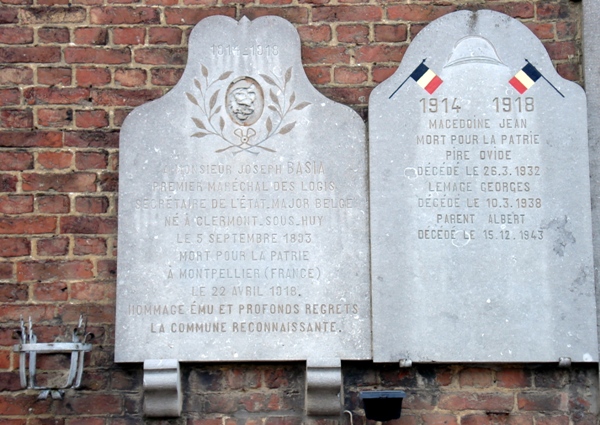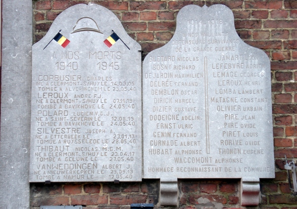 Localisation de ces plaques: Aux Houx, sur la façade de l'école. Coordonnées GPS: +50°32'54.54", +5°23'56.40". Inscriptions figurant sur les plaques Première plaque (en partant de la gauche) "1914 - 1918 [Un nom, avec mention du grade ainsi que des dates et lieux de naissance et de décès] HOMMAGE ÉMU ET PROFONDS REGRETS LA COMMUNE RECONNAISSANTE." Deuxième plaque "1914 - 1918 [Quatre noms, non classés par ordre alphabétique, avec mention de la date de décès]" Troisième plaque "À NOS MORTS 1940 - 1945 [Six noms, classés par ordre alphabétique, avec mention des dates et lieux de naissance et de décès]" Quatrième plaque "1914 - 1918 À NOS VAILLANTS DÉFENSEURS SURVIVANTS DE LA GRANDE GUERRE [Vingt-cinq noms, rangés par ordre alphabétique sur deux colonnes] HOMMAGE RECONNAISSANT DE LA COMMUNE" Voir les noms gravés sur les plaques |