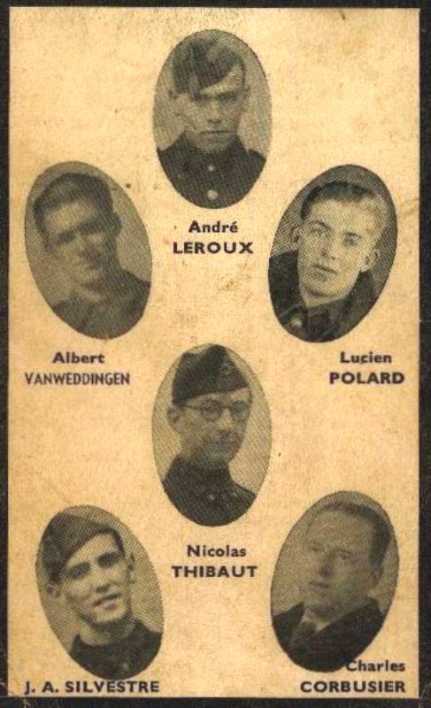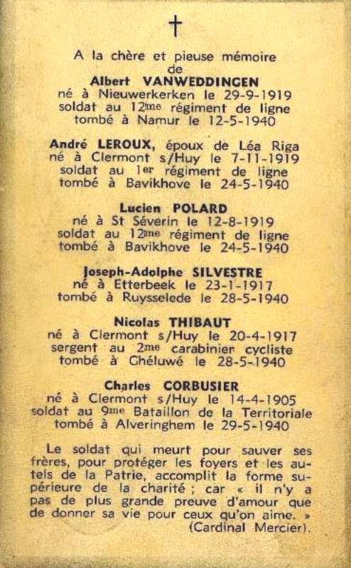 Localisation: Collection privée. Inscriptions figurant sur le document "À LA CHÈRE ET PIEUSE MÉMOIRE DE [Six noms, avec photos, classés d'abord par ordre chronologique des décès et ensuite par ordre alphabétique, avec mention des lieu et date de naissance, des grade et régiment, ainsi que des lieu et date de décès] LE SOLDAT QUI MEURT POUR SAUVER SES FRÈRES, POUR PROTÉGER SES FOYERS ET LES AU- TELS DE LA PATRIE, ACCOMPLIT LA FORME SU- PRÊME DE LA CHARITÉ ; CAR "IL N'Y A PAS DE PLUS GRANDE PREUVE D'AMOUR QUE DE DONNER SA VIE POUR CEUX QU'ON AIME" (CARDINAL MERCIER)" Voir les noms mentionnés sur le souvenir |