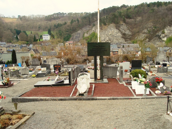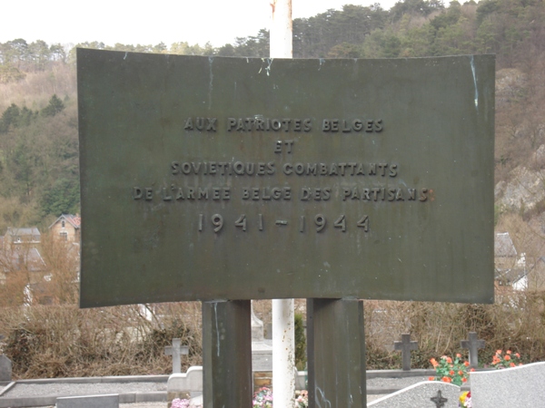 Localisation de ce monument: Cimetière, Rue du Thier Pirard. Coordonnées GPS: +50° 28' 30.89", +5° 34' 48.55". Inscriptions figurant sur le monument Face avant "БЕЛЬГИЙСКИМ ЛАТРИОТАМ И СОВЕТСКИМ ВОИНАМ, СРАЖАВШИМСЯ В БЕЛЬГИЙСКОЙ ПАРТИЗАНСКОЙ АРМИИ 1941- 1944" Face arrière "AUX PATRIOTES BELGES ET SOVIÉTIQUES COMBATTANTS DE L'ARMÉE BELGE DES PARTISANS 1941 - 1944" Le texte belge est une traduction du texte russe. Ce monument ne comporte pas de noms. Cependant, deux résistants russes sont enterrés au cimetière de Comblain-au-Pont Voir les noms de ces résistants russes |