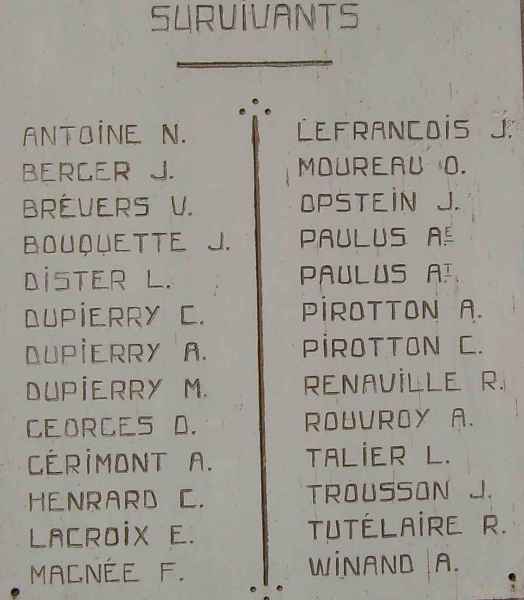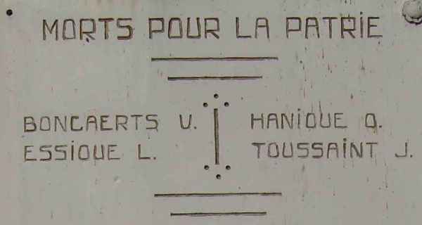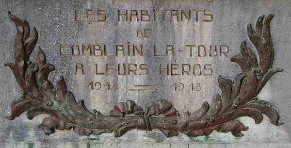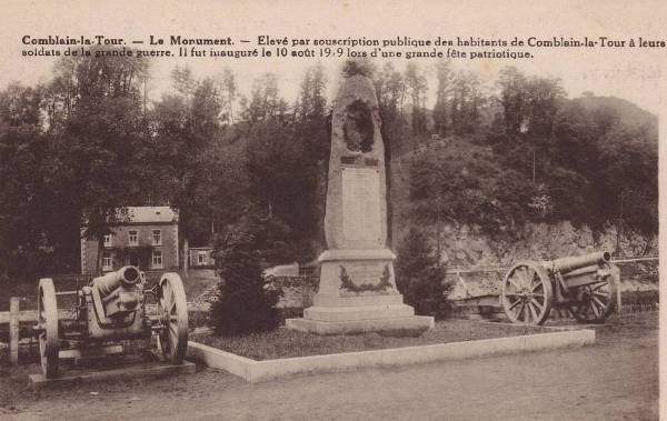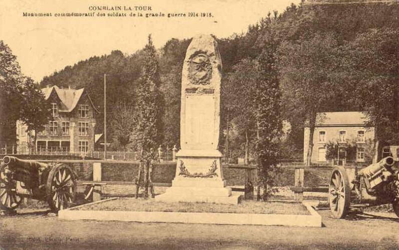 Localisation de ce monument: Place de la Gare. Coordonnées GPS: +50° 27' 22.69", +5° 34' 2.20". Inscription figurant sur le monument "1914 - 1918 MORTS POUR LA PATRIE [Quatre noms, classés par ordre alphabétique et rangés sur deux colonnes] SURVIVANTS [Vingt-six noms, classés par ordre alphabétique et rangés sur deux colonnes] LES HABITANTS DE COMBLAIN-LA-TOUR À LEURS HÉROS 1914 - 1918" Élevé par souscription publique et inauguré le 10 août 1919 Voir les noms gravés sur ce monument |