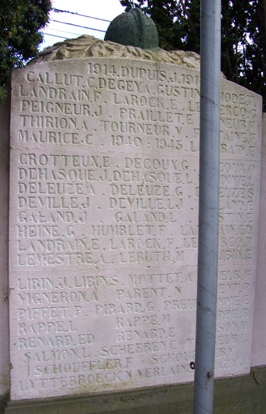 Localisation de ce monument: Rue de Wasseiges. Coordonnées GPS: +50° 39' 26.00", +5° 3' 43.62". Inscription figurant sur le monument Face avant du monument "CREHEN À SES HÉROS CAMPAGNE 1914 - 18 [Trois noms] DÉFENSEURS FRANÇAIS ET BELGES DES 12 ET 13 MAI 1940 [Douze noms, dont neuf Français] ILS SONT MORTS POUR QUE NOUS VIVIONS" Face arrière du monument "1914 - 1918 [Quinze noms] 1940 - 1945 [Quarante-neuf noms]" Voir les noms mentionnés sur ce monument |