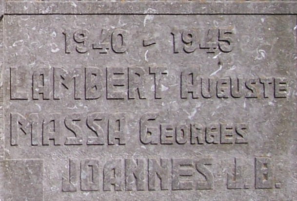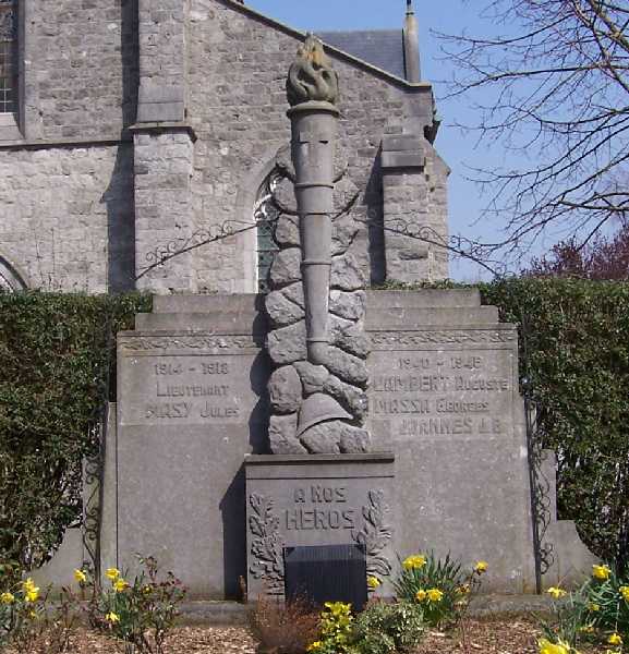 Localisation de ce monument: Rue Jules MASY, à proximité immédiate de l'église. Coordonnées GPS: 50° 39' 53.95 N, 5° 11' 13.20 E. Inscription figurant sur le monument "1914 - 1918 [Un nom] 1940 - 1945 [Trois noms] À NOS HÉROS" Voir les noms mentionnés sur ce monument |