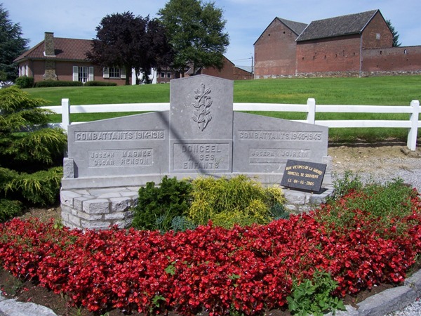 Localisation de ce monument: Rue Oscar RENSON, au coin du chemin qui monte vers l'église. Coordonnées GPS: 50° 38' 51" N, 5° 19' 13" E. Inscription figurant sur le monument Panneau gauche "COMBATTANTS 1914 - 1918 [Deux noms]" Panneau central "DONCEEL À SES ENFANTS" Panneau droit "COMBATTANTS 1940-1945 /" [Un nom]" Plaque commémorative posée à côté du monument "AUX VICTIMES DE LA GUERRE DONCEEL SE SOUVIENT LE 08 - 05 - 2005" Voir les noms mentionnés sur ce monument |