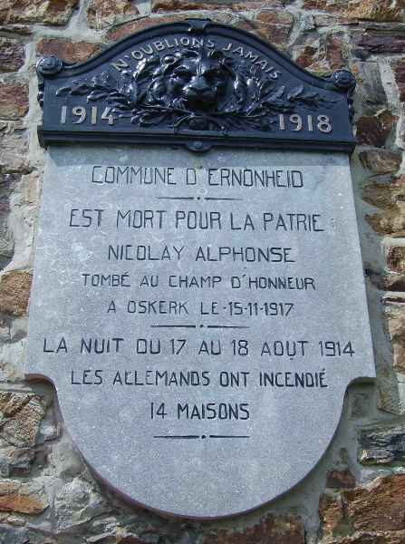 Localisation de ce monument: Ernonheid-Village, sur la façade de l'ancienne école communale, à quelques dizaines de mètres du monument aux morts des deux guerres. Coordonnées GPS: +50° 24' 14.42", +5° 39' 57.53". Inscription figurant sur le monument "N'OUBLIONS JAMAIS 1914 - 1918 COMMUNE D'ERNONHEID EST MORT POUR LA PATRIE [Un nom, avec date et lieu de décès] LA NUIT DU 17 AU 18 AOÛT 1914 LES ALLEMANDS ONT INCENDIÉ 14 MAISONS" Pour un récit détaillé des événements qui se sont déroulés à Ernonheid le 17 août 1914, on consultera le site de Marcel EVRARD. Plus d'informations concernant cette victime |