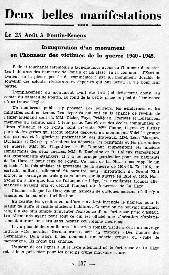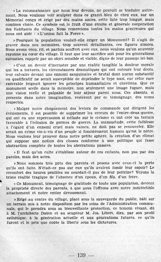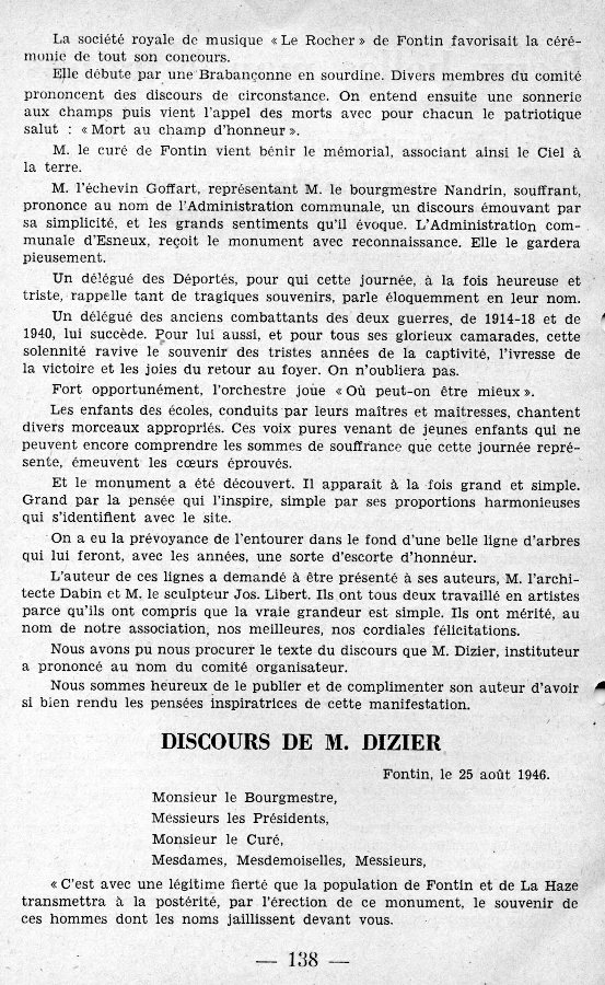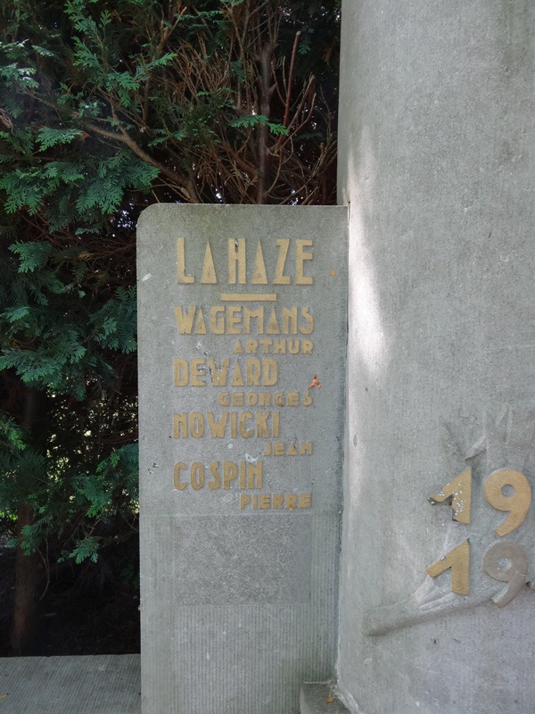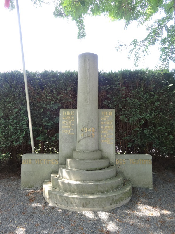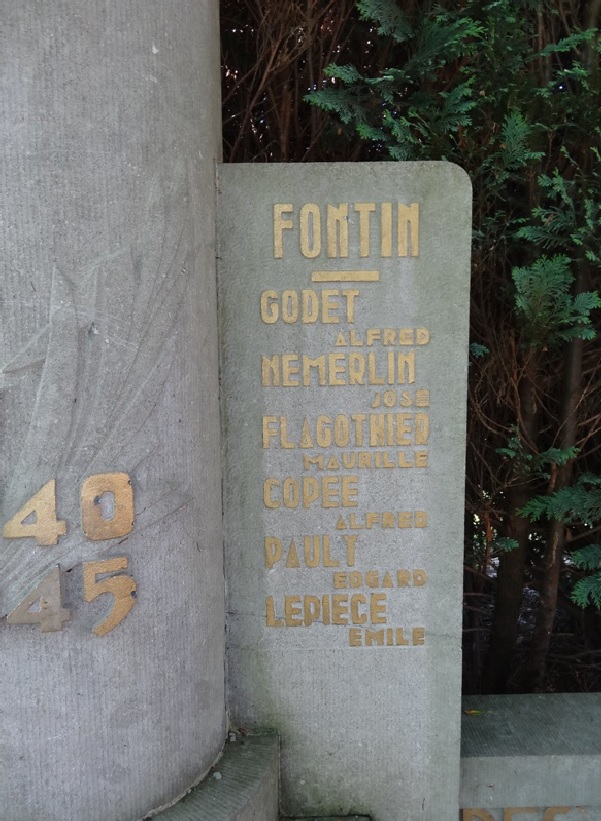 Localisation: Rue Laide Voie à Fontin. Coordonnées GPS: +50°31'37.38", +5°35'14.35" Inscriptions "LA HAZE [Quatre noms, non classés par ordre alphabétique] FONTIN [Six noms, non classés par ordre alphabétique] 1940 / 1945 AUX VICTIMES DES TEUTONS" Sculpteur : J. LIBERT. Architecte : O. DAVIN. Inauguration: 25 août 1946 Voir les noms gravés sur ce monument |