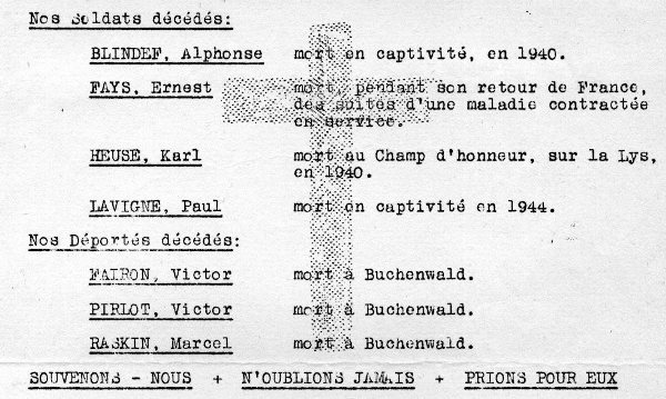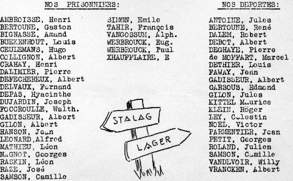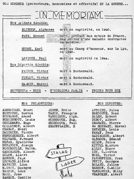 Localisation de ce document: Bulletin du Cercle Saint-Michel d'Esneux, n° 14, 1er juin 1945. Collection privée, Esneux. Inscription figurant sur le document "NOS MEMBRES (PROTECTEURS, HONORAIRES ET EFFECTIFS) ET LA GUERRE... IN MEMORIAM NOS SOLDATS DÉCÉDÉS: [Quatre noms, classés par ordre alphabétique, avec mention de l'année et des circonstances du décès] NOS DÉPORTÉS DÉCÉDÉS: [Trois noms, classés par ordre alphabétique, avec mention du lieu de décès] SOUVENONS-NOUS + N'OUBLIONS JAMAIS + PRIONS POUR EUX NOS PRISONNIERS: [Vingt-huit noms, classés par ordre alphabétique] NOS DÉPORTÉS: [Vingt-et-un noms, classés par ordre alphabétique]" Voir la liste des noms cités dans ce document |