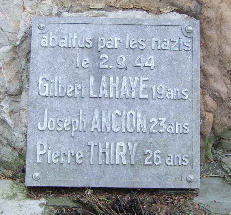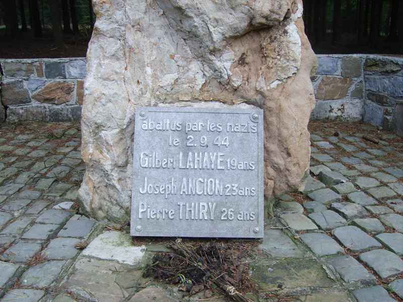 Localisation de ce monument: Dans le bois du Hé du Pouhon, au carrefour de quatre chemins (Vôye di Brâ, le Burnontige/le Thier, Vôye dèl Hé dè Pouhon et le Burnontige/Malboutée). Coordonnées GPS: +50°22'43.11", +5°37'35.86" Inscription figurant sur le monument "ABATTUS PAR LES NAZIS LE 2.9.44 [Trois noms, classés par âge]" Voir les noms gravés sur ce monument |