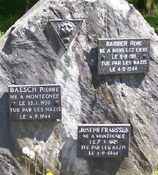 Localisation de ce monument: Rue des Marnières, quartier des Trixhe. Coordonnées GPS: +50° 36' 02.95", +5° 26' 39.01". Inscriptions figurant sur le monument [Quatre plaques en pierre. Une plaque avec le blason de l'Armée secrète, trois plaques portant chacune un nom, avec indication des dates et lieux de naissance et de décès]" Voir les noms mentionnés sur ce monument |
