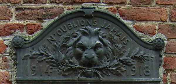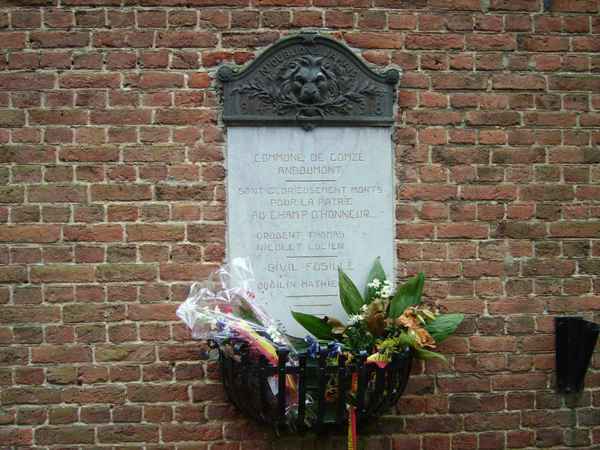 Localisation de ce monument: Salle communale des Forges "Le Tilleul", rue d'Andoumont n° 4 (au pied de la côte des Forges). Coordonnées GPS: +50° 32' 41.00", +5° 41' 29.40" Inscription figurant sur le monument "N'OUBLIONS JAMAIS 1914 - 1918 COMMUNE DE GOMZÉ ANDOUMONT SONT GLORIEUSEMENT MORTS POUR LA PATRIE AU CHAMP D'HONNEUR [Deux noms, classés par ordre alphabétique] CIVIL FUSILLÉ [Un nom]" Voir les noms mentionnés sur cette plaque |
