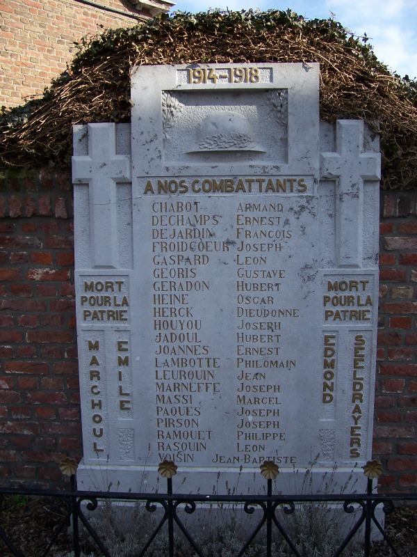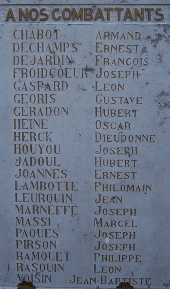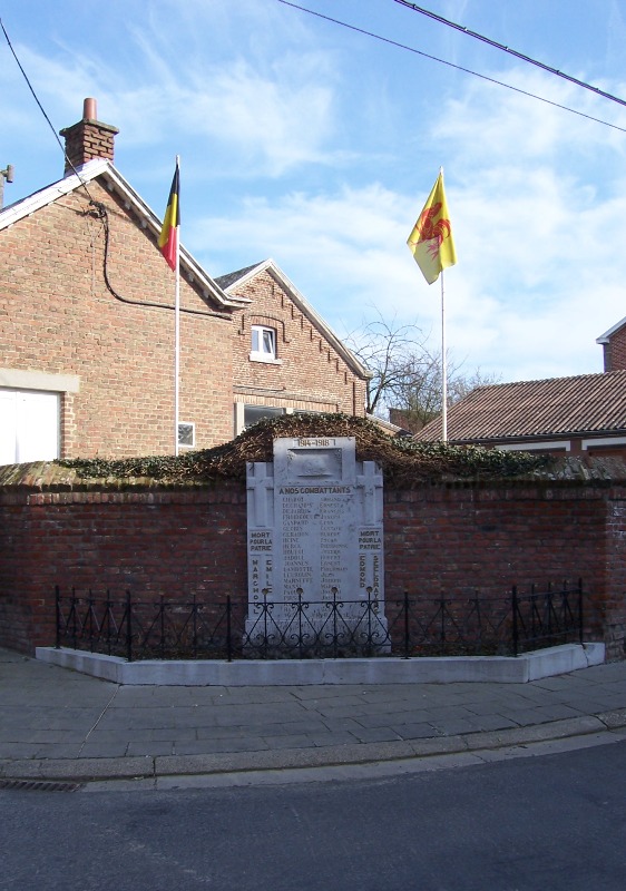 Localisation de ce monument: Au coin des rues Gaston GASPARD et Joseph NOVILLE. Nouvelle localisation de ce monument: Rue de Prâle, sur le côté gauche de l'église Saint-Denis. Coordonnées GPS: +50° 40' 44.32", +5° 13' 28.32" Nouvelles coordonnées GPS: +50° 40' 44.53", +5° 13' 27.41" Inscriptions figurant sur le monument "1914 - 1918 À NOS COMBATTANTS [Vingt-et-un noms, classés par ordre alphabétique] MORT POUR LA PATRIE [Deux noms]" Par ailleurs, on trouve dans le cimetière communal la sépulture d'un soldat de 1940-1945 né à Mons et mort à Grand-Axhe. Son nom a été ajouté dans la base de données Informations complémentaires: Le monument a été rénové et déplacé et la stèle est nouvelle. Il se trouve maintenant sur le côté gauche l'église (voir nouvelle localisation et nouvelles coordonnées GPS ci-dessus). Ce monument a été inauguré le 24 mai 2014 par les autorités et les associations patriotiques. Inscriptions figurant sur le nouveau monument "1914 - 1918 À NOS COMBATTANTS COMMUNE DE GRAND-AXHE SONT TOMBÉS AU CHAMP D'HONNEUR 1914-1918 [Deux noms, avec lieu et date de décès, classés par ordre chronologique de décès] 1940-1945 SONT TOMBÉS AU CHAMP D'HONNEUR [Trois noms, avec lieu et date de décès, classés par ordre chronologique de décès] GLOIRE À NOS PRISONNIERS HONNEUR À NOS COMBATTANTS RECONNAISSANCE AUX TRAVAILLEURS DÉPORTÉS RÉFRACTAIRES AUX VAILLANTS RÉSISTANTS QUE LEUR SACRIFICE NE SOIT JAMAIS OUBLIÉ MORT POUR LA PATRIE [Deux noms]" Voir les noms mentionnés sur le monument et sur la tombe individuelle dans le cimetière |