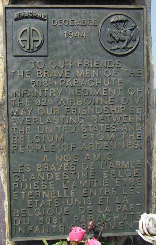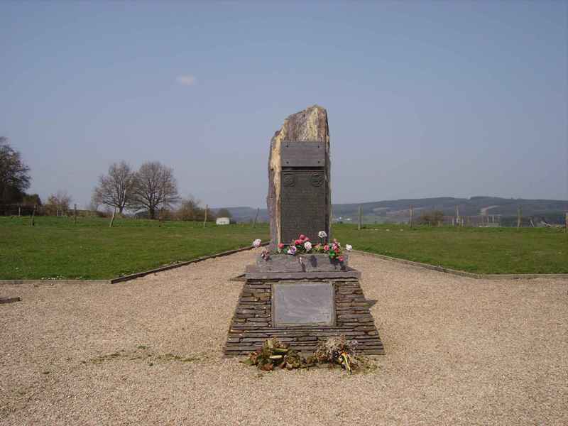 Localisation de ce monument: Lieu-dit Col d'Al Hesse, altitude 475 m. Coordonnées GPS: 50° 16' 44.93", +5° 51' 11.00". Inscriptions figurant sur le monument Face avant "AU COLONEL MENDEZ LE 7 JANVIER 1945 : "CECI EST LE MEILLEUR JOB QUI FUT JAMAIS RÉALISÉ POUR MOI" GÉNÉRAL J.-M. GAVIN." "DÉCEMBRE 1944 TO OUR FRIENDS THE BRAVE MEN OF THE 508th PARACHUTE INFANTRY REGIMENT OF THE 82d AIRBORNE DIV. MAY OUR FRIENDSHIP BE EVERLASTING BETWEEN THE UNITED STATES AND BELGIUM. FROM THE PEOPLE OF ARDENNES. À NOS AMIS LES BRAVES DE L'ARMÉE CLANDESTINE BELGE. PUISSE L'AMITIÉ ÊTRE ÉTERNELLE ENTRE LES ÉTATS-UNIS ET LA BELGIQUE. DE LA PART DU 508th PARACHUTE INFANTRY REGIMENT" "THANK YOU TO OUR LIBERATORS 1944 - 1994" "[Schéma représentant les positions de la 82nd Division le dimanche 7 janvier 1945]" "THANK YOU 1944 - 1994" Face latérale gauche "À L'AUBE DU 07 JANVIER 1945, DANS ± 50 CM DE NEIGE, LA 325e GLIDER COMMANDÉE PAR LE COLONEL CHARLES BILLINGSLEA VENANT DE BRUX. À 5 H. DU MATIN, ATTAQUE PAR SURPRISE LE THIER DEL PREUX. DES COMBATS CORPS À CORPS ONT LIEU À ± 500 M AU NORD-OUEST DE CE MONUMENT. POUR LE DÉBUT DE L'APRÈS-MIDI, LES AMÉRICAINS ÉTAIENT MAÎTRES DE CETTE CRÊTE MAIS BEAU- COUP DE CES BRAVES Y LAISSÈRENT LEUR VIE. " Face latérale droite "LE 07 JANVIER 1945, LA 508e AIRBORNE, QUITTANT MENIL BIEN AVANT L'AUBE, ATTAQUE À TERRAIN DÉCOUVERT LE THIER DU MONT AU SUD-EST DE CE MONUMENT. LE SERGENT FRANK SIROVICA LANCE SES TROUPES À L'ASSAUT DE CETTE COLLINE ABANDONNÉE LA VEILLE DE NOËL 1944. LES ALLEMANDS BIEN CAMOUFLÉS ET ARMÉS DE CANONS DE 75 ET 88 FONT BEAUCOUP DE MORTS PARMI CES BRAVES. LE SOLDAT WILT WARREN APERCEVANT UN DE CES MONSTRES DE 88, ÉPAULA SON BAZOOKA BLESSANT MOR- TELLEMENT UN DE SES SERVANTS ET METTANT LES AUTRES EN FUITE. À LA FIN DE CETTE JOURNÉE INOUBLIABLE, LES AMÉRICAINS AVAIENT PERDU 196 HOMMES." Ce monument ne comporte pas de noms de victimes |
