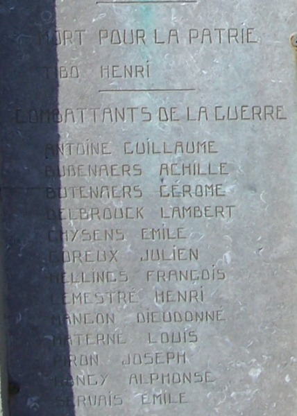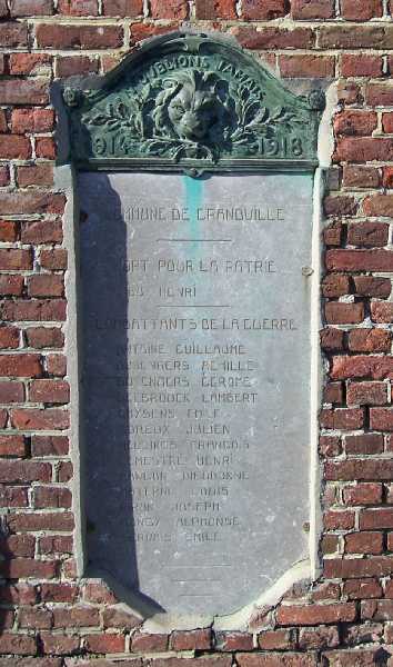 Localisation de ce monument: Sur le mur du cimetière, rue Louis MARÉCHAL. Coordonnées GPS: +50° 43' 11.16", +5° 19' 55.88". Inscription figurant sur le monument "N'OUBLIONS JAMAIS 1914 - 1918 COMMUNE DE GRANDVILLE MORT POUR LA PATRIE [Un nom] COMBATTANTS DE LA GUERRE [Treize noms]" Voir les noms mentionnés sur ce monument |
