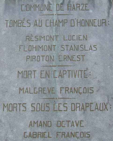 Localisation de ce monument: Place de Chézy. Coordonnées GPS: +50° 26' 13.75", +5° 39' 57.29". Inscription figurant sur le monument "N'OUBLIONS JAMAIS 1914 - 1918 COMMUNE DE HARZÉ TOMBÉS AU CHAMP D'HONNEUR [Trois noms, non classés par ordre alphabétique] MORT EN CAPTIVITÉ [Un nom] MORTS SOUS LES DRAPEAUX [Deux noms, classés par ordre alphabétique]" Voir les noms mentionnés sur cette plaque |