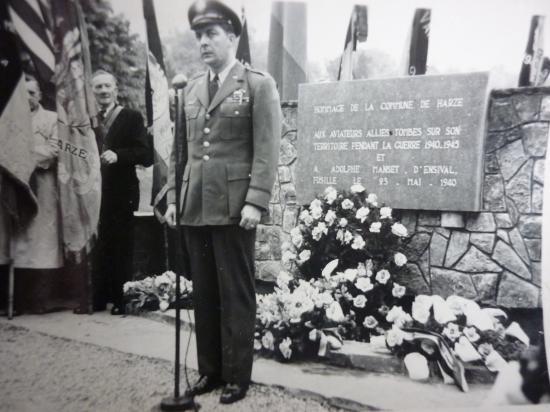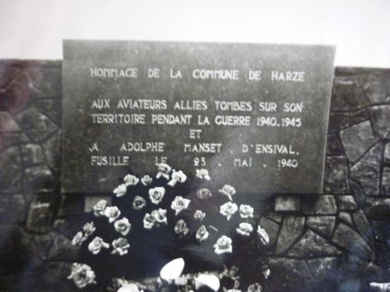 Localisation de ce monument: Rue de Bastogne à Harzé, face au château. Coordonnées GPS: +50°26'27.80", +5°39'55.30". Inscription figurant sur le monument "HOMMAGE DE LA COMMUNE DE HARZÉ AUX AVIATEURS ALLIÉS TOMBÉS SUR SON TERRITOIRE PENDANT LA GUERRE 1940-1945 ET À ADOLPHE MANSET, D'ENSIVAL, FUSILLÉ LE 23 - MAI - 1940" Inauguration: 3 juin 1951 (Source: Pierre NINANE). On trouvera des informations complémentaires sur les jours de guerre à Harzé en 1940-1945, et notamment sur les aviateurs alliés morts sur le territoire de la commune ainsi que sur Adolphe MANSET, sur le site que Pierre NINANE a consacré au village d'Harzé. Plus d'informations concernant cette personne |