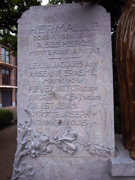 Localisation de ce monument: Intersection de l'avenue J. J. POUSSET avec la rue de la Vallée. Coordonnées GPS: +50°42'44.80", +5°40'52.10". Inscriptions figurant sur la plaque "HERMALLE SOUS-ARGENTEAU À SES HÉROS MORTS POUR LA PATRIE [Sept noms, avec indication du grade, classés d'abord par grade et ensuite par ordre alphabétique dans le grade]" Voir les noms gravés sur ce monument |