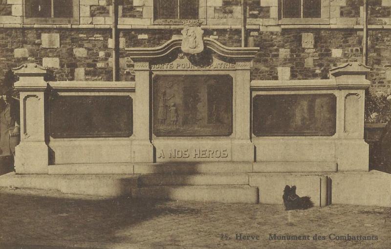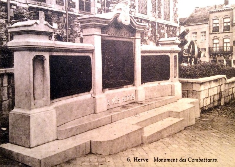 Localisation de ce monument: Rue du Collège, à côté de l'église Saint-Jean-Baptiste. Coordonnées GPS: +50°38'22.33", +5°47'41.84" Inscriptions figurant sur le monument Partie centrale supérieure "MORTS POUR LA PATRIE 1914 1918 SOLDATS [Dix-neuf noms, classés par ordre alphabétique] FUSILLÉS [trente-huit noms, sur deux colonnes, classés par ordre alphabétique]" Plaque supérieure à gauche "COMBATTANTS [Quatre-vingt sept noms, sur quatre colonnes, classés par ordre alphabétique]" Plaque supérieure à droite "[Cinquante-huit noms, sur deux colonnes, classés par ordre alphabétique] PRISONNIERS CIVILS [trente noms, sur deux colonnes, classés par ordre alphabétique]" Partie centrale inférieure "1940 1945 FUSILLÉS [Quatre noms, sur deux colonnes, classés par ordre alphabétique] MORTS AU CHAMP D'HONNEUR [Neuf noms, sur deux colonnes, classés par ordre alphabétique] À NOS HÉROS" Plaque inférieure à gauche "PRISONNIERS DE GUERRE [Cinq noms, sur deux colonnes, classés par ordre alphabétique] PRISONNIERS POLITIQUES [Sept noms, sur deux colonnes, classés par ordre alphabétique]" Plaque inférieure à droite "RÉSISTANTS [Deux noms, sur deux colonnes, classés par ordre alphabétique] CIVILS [Huit noms, sur deux colonnes, classés par ordre alphabétique]" Informations complémentaires: Statuaire: F. HEUZE Architecte: Ch. PHILIPPART Entrepreneur: H. DELHAYE Matériaux: petit granit, bronze. Hauteur : 3,80 m Dans la partie centrale, sous les armoiries de la Ville et les mots « MORTS POUR LA PATRIE » inscrits dans la pierre, une grande plaque de bronze représente en relief deux écolières lisant les noms des morts de la Première Guerre. Fernand HEUZE a réalisé une réplique en bois de la plaque centrale pour le mémorial installé dans le nouvel hôtel de ville inauguré en 1930. Le monument a lui été inauguré le 15 août 1928 (Source: [276]) Voir les noms mentionnés sur ce monument |