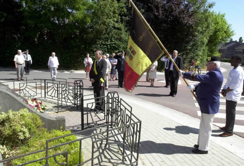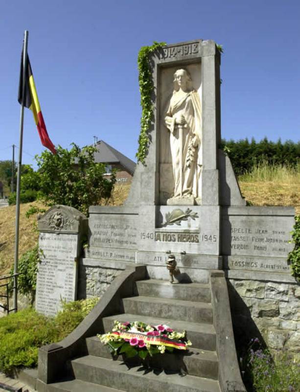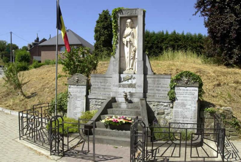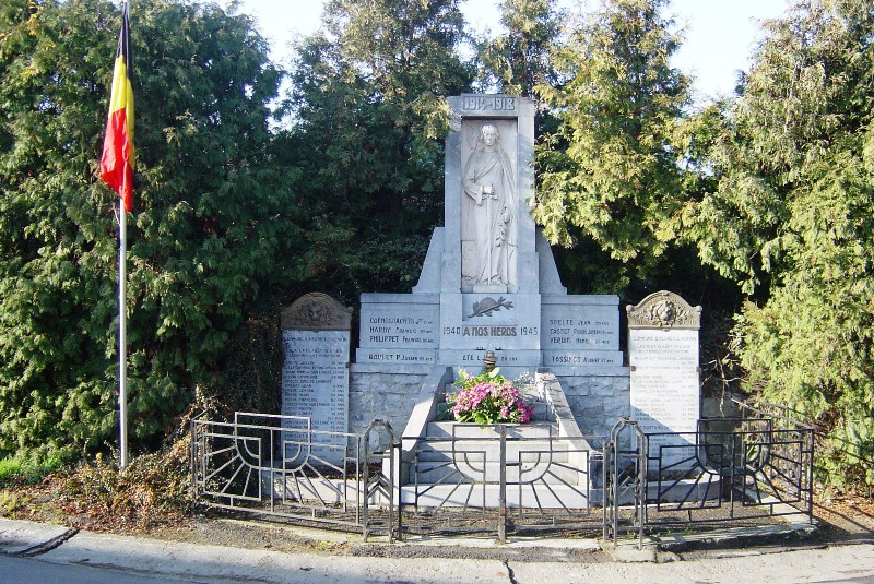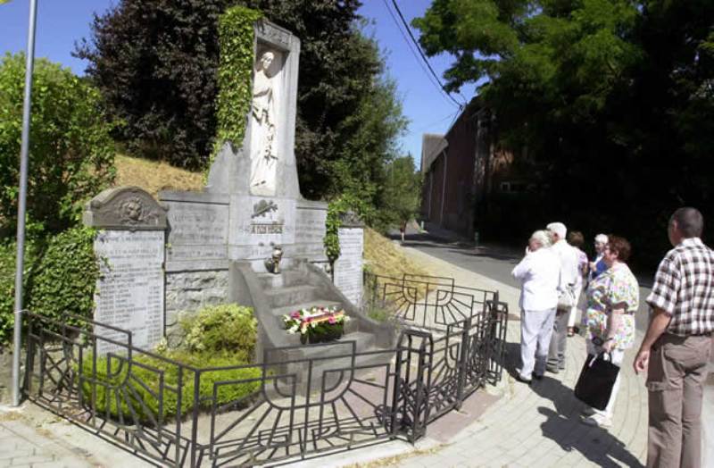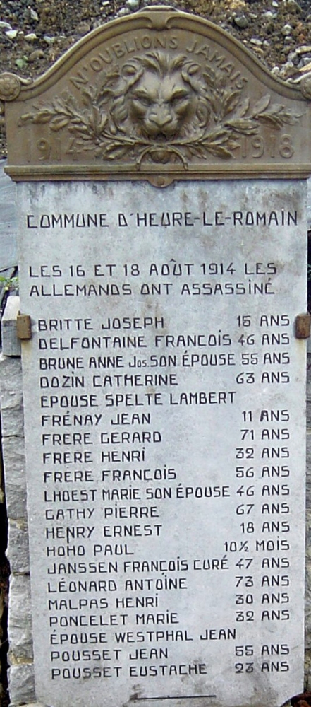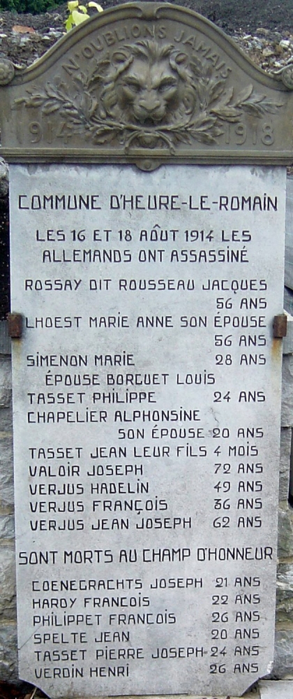 Localisation de ce monument: Au coin de la rue du Vivier et de la rue François JANSSEN. Coordonnées GPS: +50° 43' 50.48", +5° 37' 51.63". Inscription figurant sur le monument Panneau gauche "N'OUBLIONS JAMAIS 1914 - 1918 COMMUNE D'HEURE-LE-ROMAIN LES 16 ET 18 AOÛT 1914 LES ALLEMANDS ONT ASSASSINÉ [Dix-huit noms, avec mention de l'âge, classés par ordre alphabétique]" Panneau droit "N'OUBLIONS JAMAIS 1914 - 1918 COMMUNE D'HEURE-LE-ROMAIN LES 16 ET 18 AOÛT 1914 LES ALLEMANDS ONT ASSASSINÉ [Dix noms, avec mention de l'âge, classés par ordre alphabétique] SONT MORTS AU CHAMP D'HONNEUR [Six noms, avec mention de l'âge, classés par ordre alphabétique]" Panneau central "1914 - 1918 194 À NOS HÉROS 1945 [Six noms de soldats morts en 1914 - 1918 (les mêmes que sur le panneau droit), avec mention de l'âge, classés par ordre alphabétique] [Trois noms de soldats morts en 1940 - 1945, avec mention de l'âge, classés par ordre alphabétique]" Pour un récit circonstancié des événements dramatiques qui se sont déroulés à Heure-le-Romain en août 1914, on consultera le site "Médecins de la Grande Guerre". Voir les noms mentionnés sur ce monument |