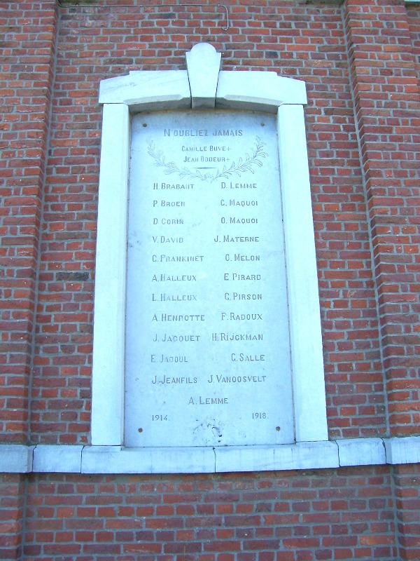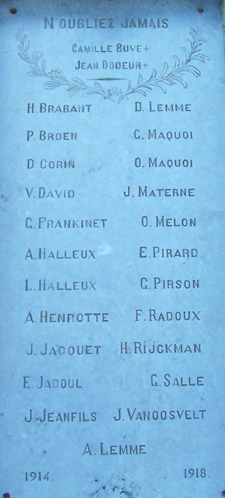 Localisation de ce monument: Rue de Lens sur Geer. Coordonnées GPS: 50° 41' 48" N, 5° 20' 32" E. Inscription figurant sur le monument "N'OUBLIEZ JAMAIS [Vingt-cinq noms, dont deux avec le symbole + accolé] 1914 - 1918" Voir les noms mentionnés sur ce monument |