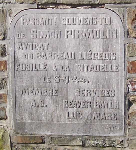 Localisation de ce monument: À l'intersection des rues de l'hôtel communal, de Hollogne et de Ruy. Coordonnées GPS: 50° 37' 40.00" N, 5° 29' 10.04" E. Inscription figurant sur le monument "PASSANT ! SOUVIENS-TOI DE SIMON PIRMOLIN AVOCAT DU BARREAU LIÉGEOIS FUSILLÉ À LA CITADELLE LE 3-9-44 MEMBRE SERVICES A.S BEAVER BATON LUC MARC" Stèle signée "MONET" Plus d'informations concernant cette personne |