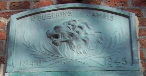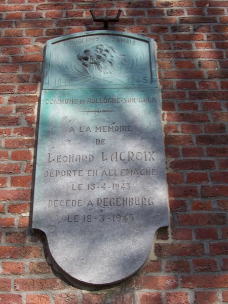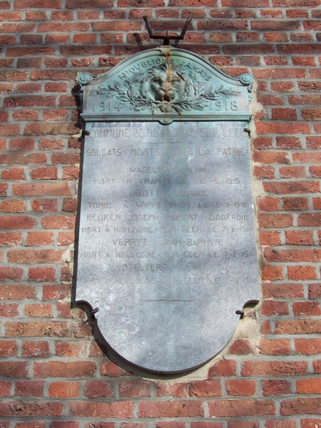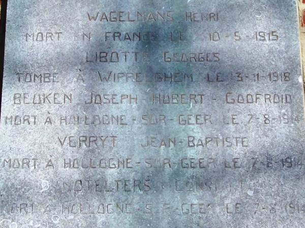 Localisation: Sur la façade de l'école, rue du Centre. Coordonnées GPS: +50° 40' 29.83", +5° 12' 41.24". Inscriptions figurant sur les plaques Plaque de droite "N'OUBLIONS JAMAIS 1914 - 1918 COMMUNE DE HOLLOGNE-SUR-GEER SOLDATS MORTS POUR LA PATRIE [Cinq noms, non classés par ordre alphabétique, avec indication du lieu et de la date de décès]" Plaque de gauche "N'OUBLIONS JAMAIS 1940 - 1945 COMMUNE DE HOLLOGNE-SUR-GEER À LA MÉMOIRE DE [Un nom, avec indication du lieu et de la date de décès]" Voir les noms mentionnés sur ce monument |