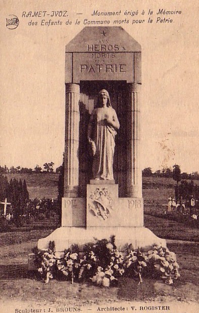 Localisation de ce monument: Dans le cimetière d'Ivoz-Ramet, Chaussée de Ramet. Coordonnées GPS: +50°35'03.86", +5°27'08.00". Inscription figurant sur le monument Face avant "AUX HÉROS MORTS POUR LA PATRIE 1914 1918 Face arrière "TOMBÉS AU CHAMP D'HONNEUR LES SOLDATS [Seize noms, classés par ordre alphabétique] LES CIVILS [Deux noms, classés par ordre alphabétique]" Côté gauche "MORTS POUR LA PATRIE 1940 1945 [Sept noms, classés par ordre alphabétique, sauf un]" Côté droit "MORTS AU CHAMP D'HONNEUR 1940 1945 [Dix noms, classés par ordre alphabétique, sauf deux]" Plaque devant le monument "À LA MÉMOIRE DE NOS HÉROS SOUVENIR DES FÊTES DU CENTENAIRE 1930" Outre les personnes ayant une plaque commémorative à leur nom, on trouve également dans ce cimetière des tombes se rapportant à des victimes non mentionnées sur le(s) monument(s) de la commune. Il nous est cependant apparu opportun d'enregistrer ici ces personnes. Voir les noms gravés sur ce monument |