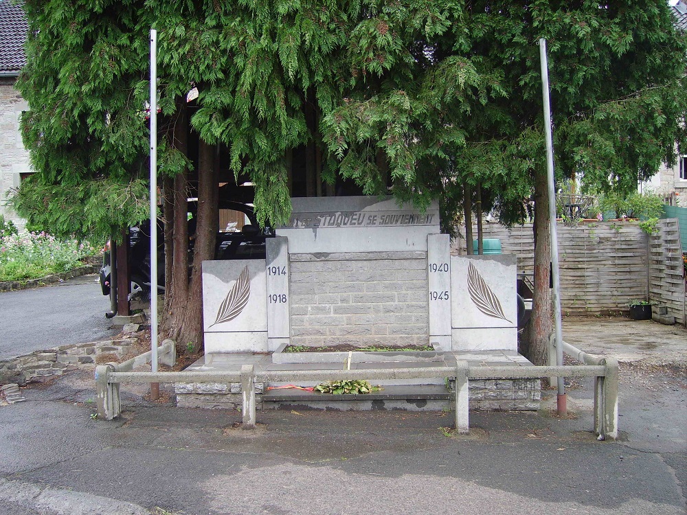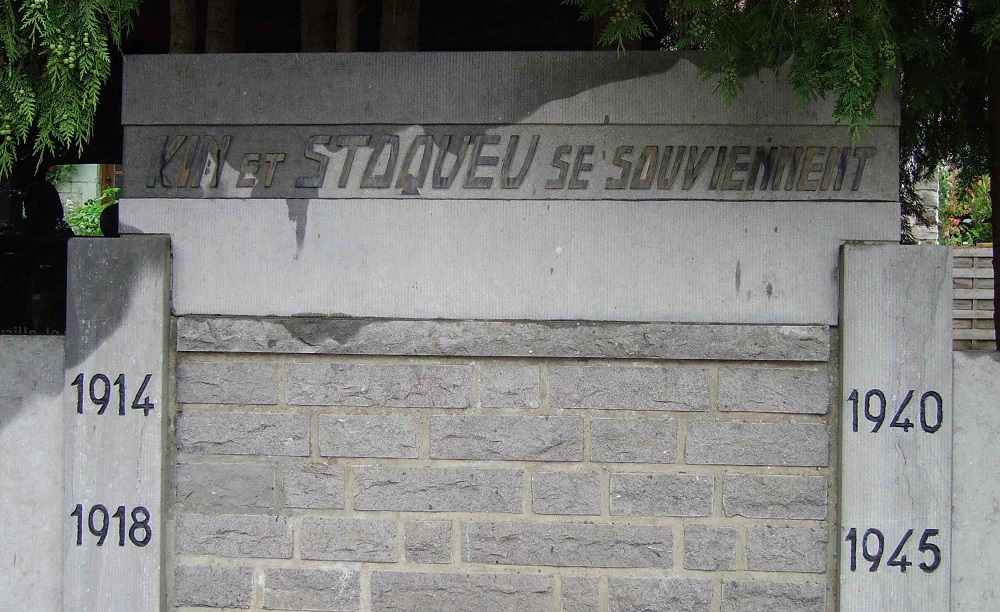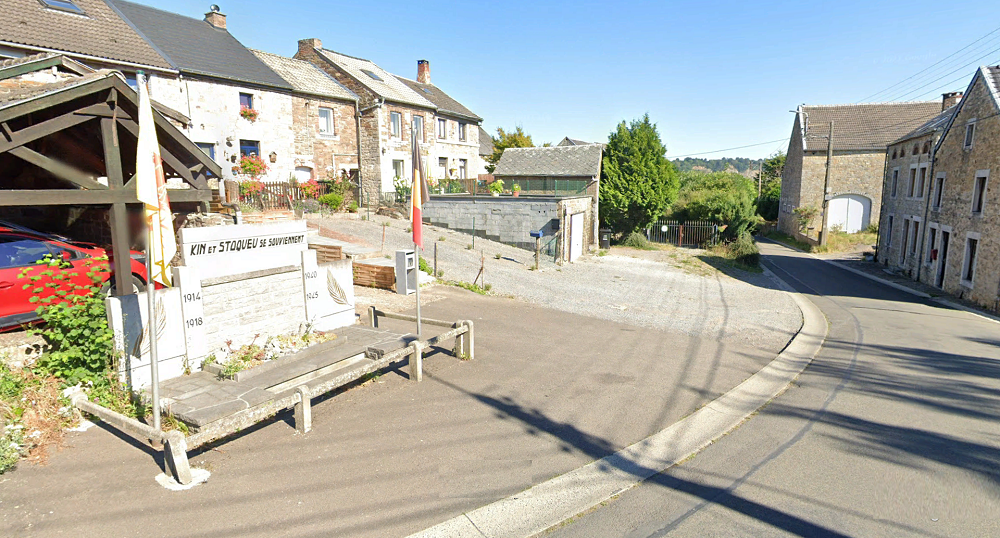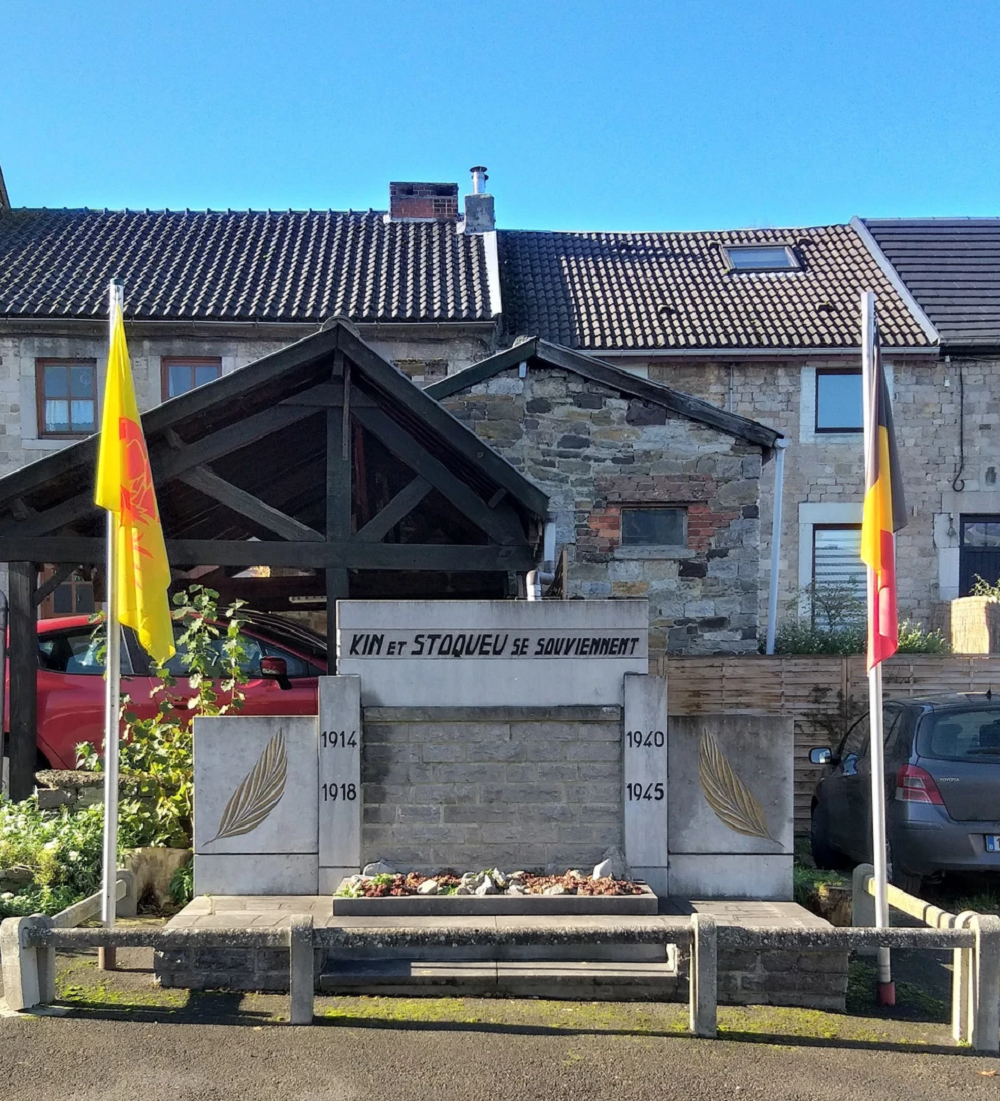 Localisation: À l'intersection des rues des rues Trixhe aux Minières et Hameau de Kin. Coordonnées GPS : +50°27'55.2", +5°41'33.0" Inscriptions "KIN ET STOQUEU SE SOUVIENNENT 1914 - 1918 1940 - 1945" Description Monument en pierre de taille et blocs de calcaire, socle en moellons et dalles de grès. (Source: Site "Aywaille: Petit patrimoine populaire") Inauguration : ce monument a été inauguré le 28 mai 1972 en présence d'une délégation de Floing (département des Ardennes), association patriotique française jumelée avec celle d'Aywaille. (Source: Site "Aywaille: Petit patrimoine populaire") Informations complémentaires Aucun nom ne figure sur ce monument car ces deux villages n'ont pas connu de pertes humaines pendant les deux guerres mondiales (Source: Site "Aywaille: Petit patrimoine populaire") Ce monument ne comporte pas de noms |