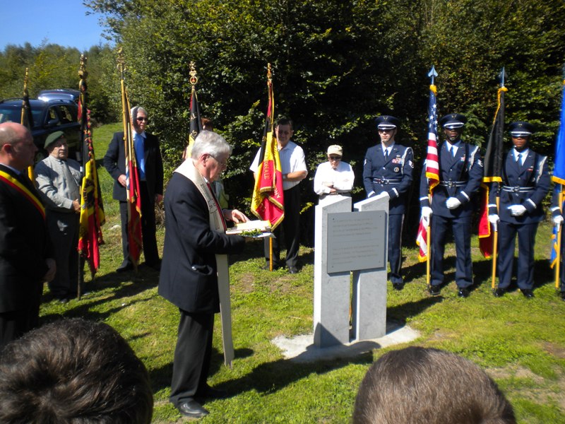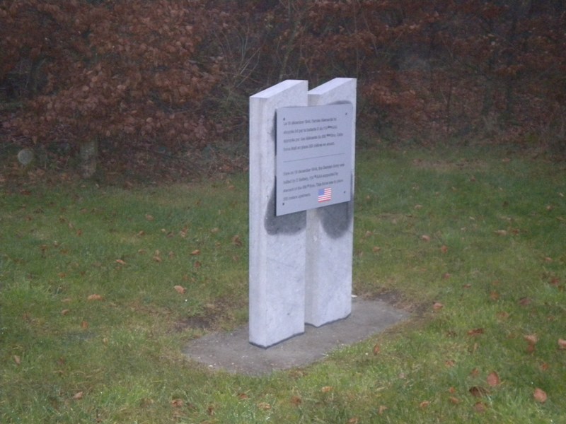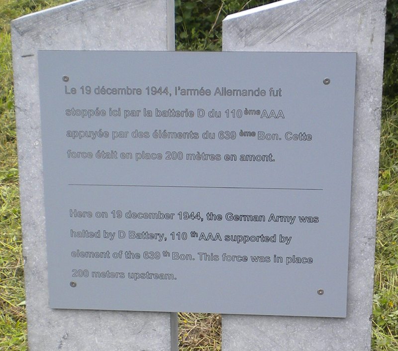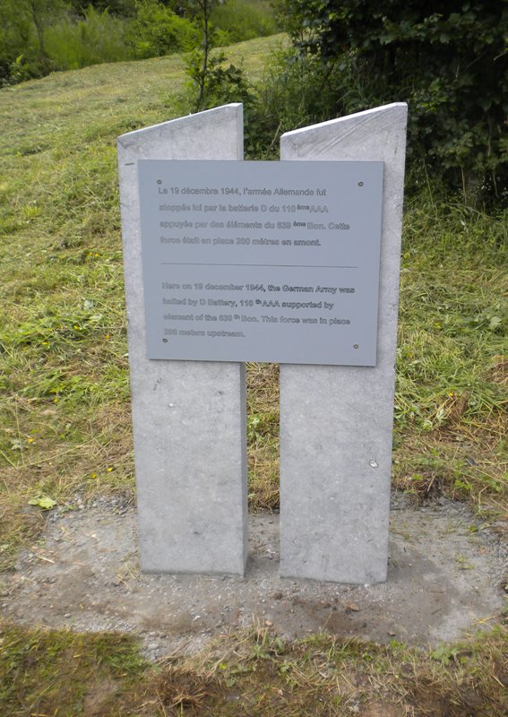 Localisation de cette plaque: Dans la côte du Rosier, entre Cour et Berinzenne (Spa). Coordonnées GPS: +50°26'45.88", +5°52'24.46" Inscription figurant sur la plaque "LE 19 DÉCEMBRE 1944, L'ARMÉE ALLEMANDE FUT STOPPÉE ICI PAR LA BATTERIE D DU 110ÈME AAA APPUYÉE PAR DES ÉLÉMENTS DU 639ÈME BON. CETTE FORCE ÉTAIT EN PLACE 200 MÈTRES EN AMONT HERE ON 19 DECEMBER 1944, THE GERMAN ARMY WAS HALTED BY D BATTERY, 110TH AAA SUPPORTED BY ELEMENT OF THE 639TH BON. THIS FORCE WAS IN PLACE 200 METERS UPSTREAM" Informations complémentaires: Placée en 2012 suite à une initiative de M. Gérard GRÉGOIRE, figure illustre de La Gleize (il est un des deux fondateurs du musée "Décembre 44" de La Gleize), elle fut inaugurée le 21 novembre 2012. Cette plaque ne comporte pas de noms |