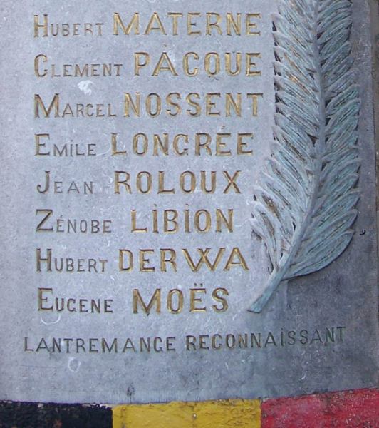 Localisation de ce monument: Au coin de la rue Edmond LEBURTON et de la place Joseph PIETTE. Coordonnées GPS: +50° 42' 40.86", +5° 17' 41.83". Inscription figurant sur le monument "1914 - 1918 À NOS HÉROS DE LA GRANDE GUERRE [Quinze noms, non classés par ordre alphabétique] LANTREMANGE RECONNAISSANT" Voir les noms mentionnés sur ce monument |