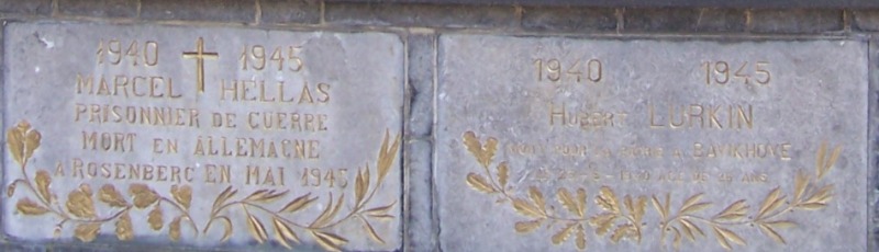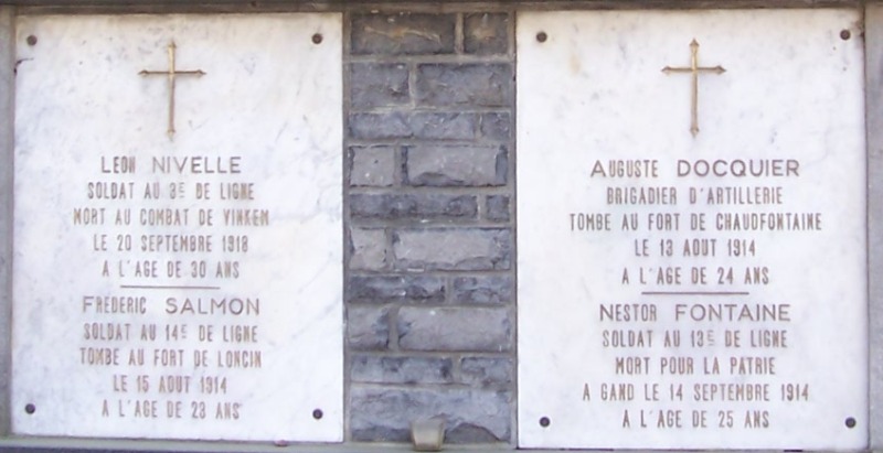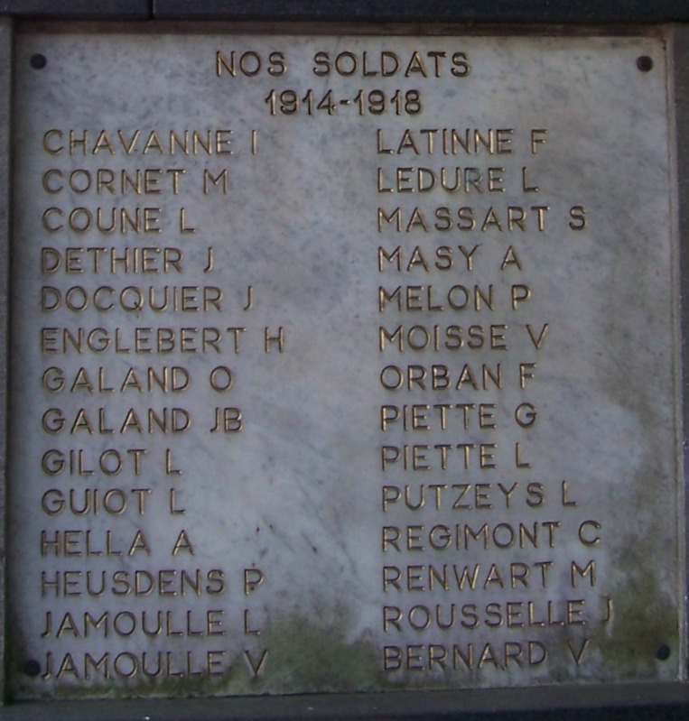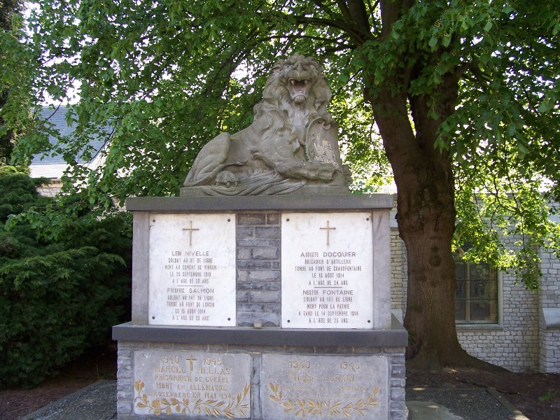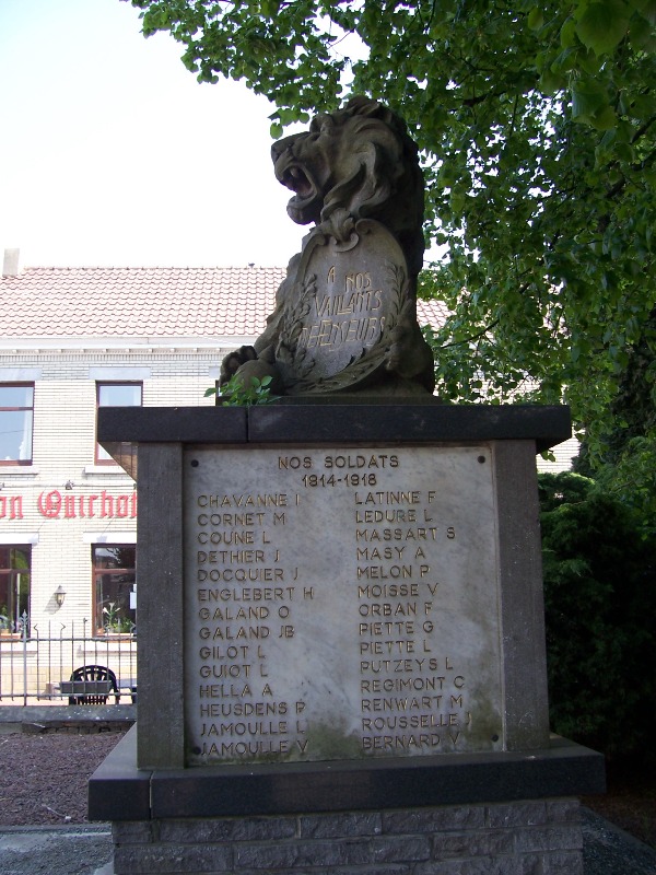 Localisation: À gauche du pignon de l'église Saint-Désiré, rue du Centre, à son intersection avec la rue du Pont. Coordonnées GPS: +50°37'23.2", +5°09'25.8" Inscription figurant sur le monument Plaques installées sur la porte d'accès au monument "N'OUBLIONS JAMAIS 1914 1918" "N'OUBLIONS JAMAIS 1914 1918" Monument proprement dit Face avant Sur l'écu tenu par le lion "À NOS VAILLANTS DÉFENSEURS Sur le corps du monument [Morts pour la patrie en 1914 - 1918] [Quatre noms, avec diverses mentions (grade, régiment, lieu et date de décès, âge au décès)] 1940 - 1945 [Deux noms, avec diverses mentions (lieu et date de décès, âge au décès)] Face latérale droite "NOS SOLDATS 1914 - 1918 [Vingt-huit noms, classés par ordre alphabétique, avec une exception en fin de liste]" Face latérale gauche "À NOS SOLDATS ET PRISONNIERS 1940 - 1945" Face arrière "L'UNION FAIT LA FORCE" Voir les noms mentionnés sur ce monument |